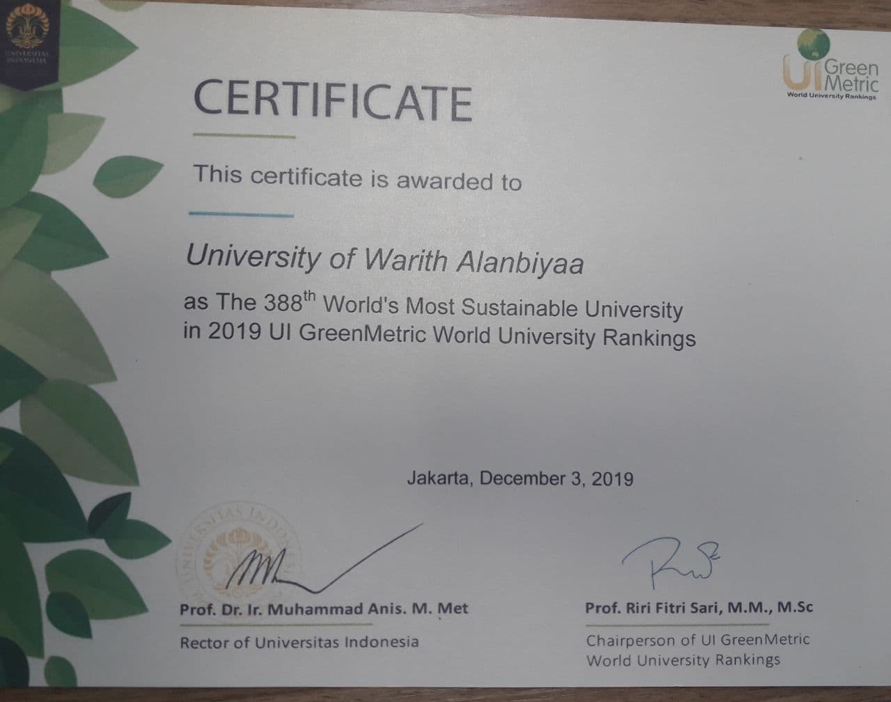 1.       دخلت  جامعتنا العزيزة بتصنيف  UIGreen Metricالعالمي للجامعات و ذلك في سنة 2019  حيث بدأت جامعة اندنوسيا بتصنيف الجامعات العالمية في عام 2010 و المعروفة لاحقا بأسم مقياس الاستدامة للتصنيف العالمي للجامعات و تهدف لقياس  الجهود  المستدامة للحرم الجامعي.