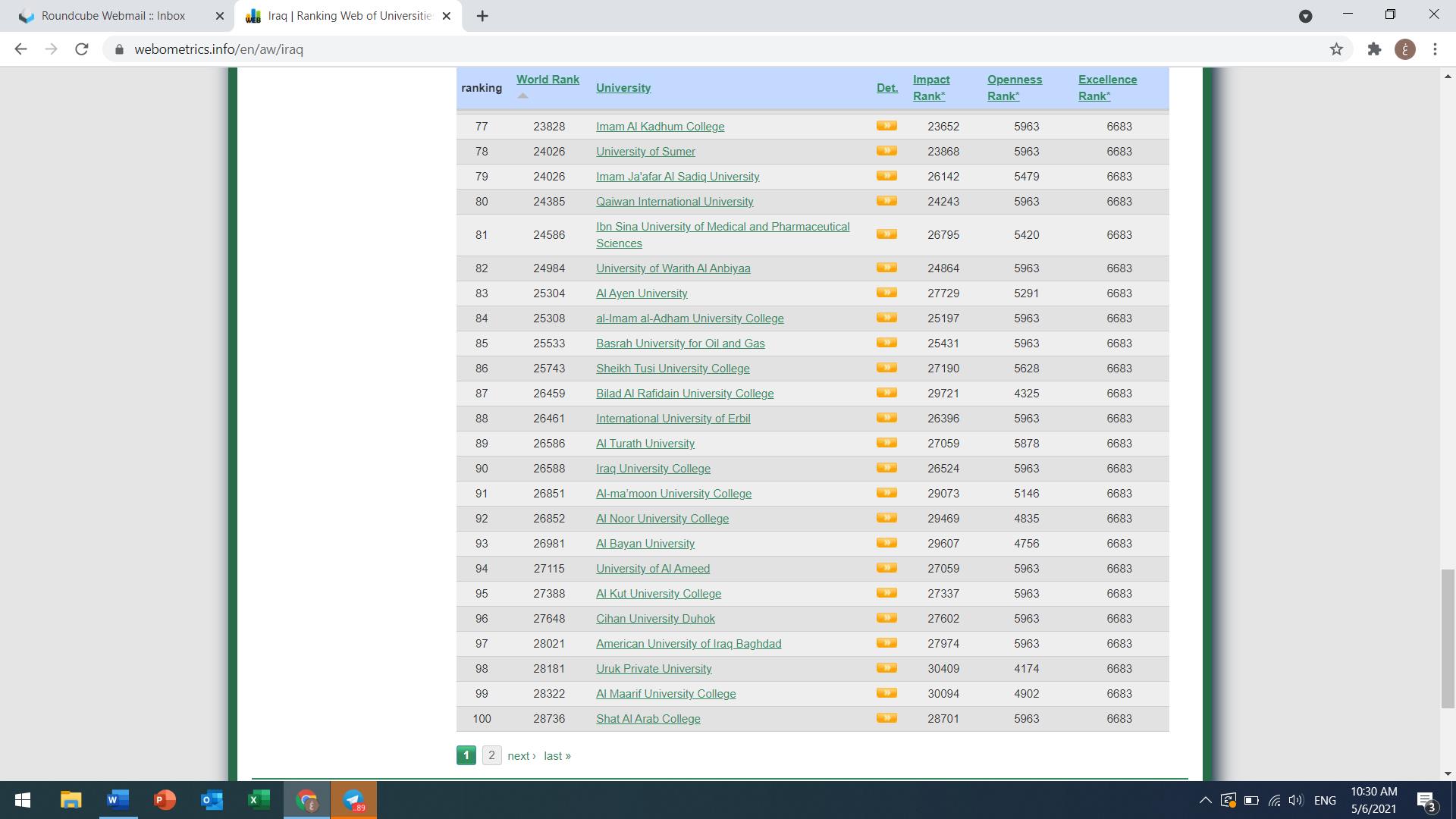 2.    دخلت جامعتنا العزيزة  بتصنيف webometrics Rankings  الاسباني , و حصلت على المرتبة 82 محليل و 24984 عالميا حيث بدا هذا التصنيف سنة 2004 حيث صنف 16000 جامعة , حيث يهدف بالدرجة الاولى الى حث الجهات الاكاديمية في العالم لتقديم ما لديها من انشطة علمية تعكس مستواها العلمي المتميز.