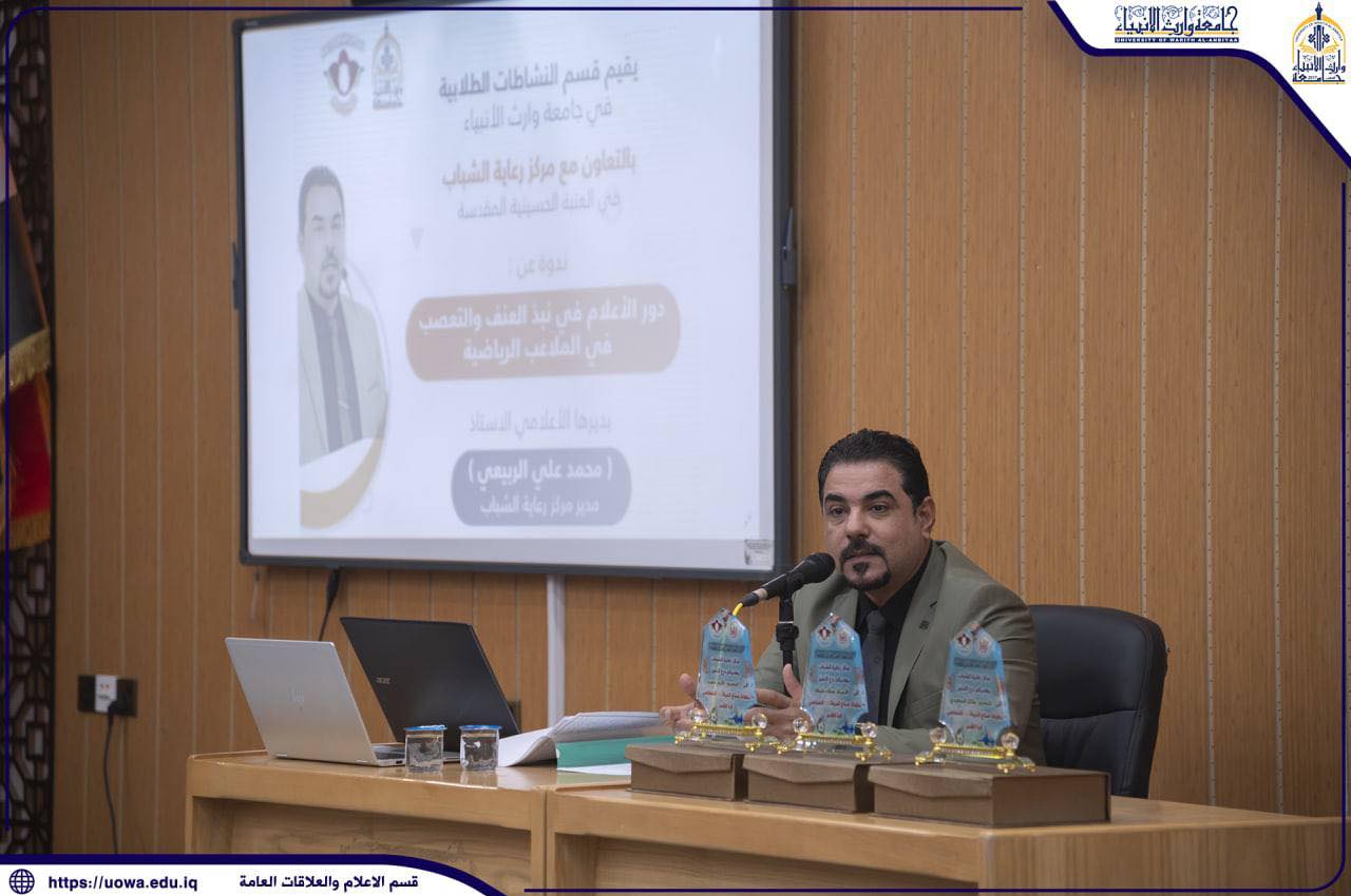 أقام قسم النشاطات الطلابية في جامعة وارث الأنبياء(عليه السلام) وبالتعاون مع مركز رعاية الشباب التابع للعتبة الحسينية المقدسة ورشة إعلامية تثقيفية بعنوان(دور الاعلام في نبذ العنف والتعصب في الملاعب) قدمها السيد محمد علي الربيعي مدير مركز رعاية الشباب