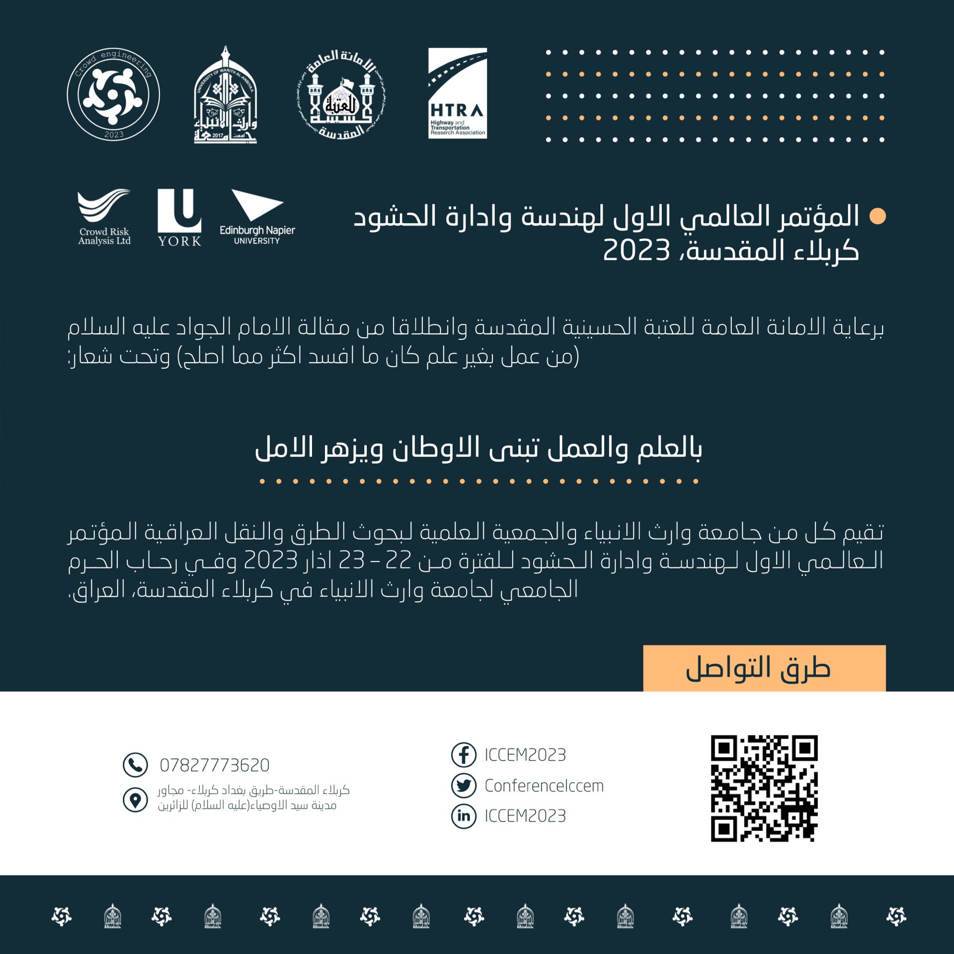 "المؤتمر العالمي الاول لهندسة وادارة الحشود كربلاء المقدسة، للفترة 22 -23 آذار 2023"