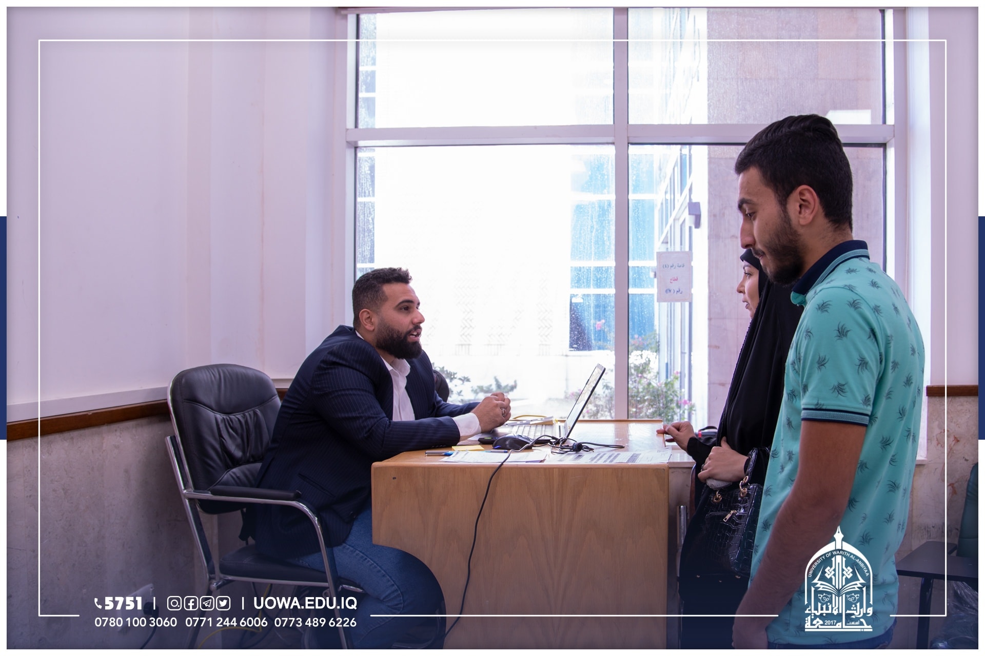 جانب من استقبال فريق التسجيل في جامعة وارث الانبياء(عليه السلام) للطلبة الاعزاء واولياء امورهم الكرام للاجابة عن استفساراتهم ومساعدتهم في انجاز اولى خطوات التقديم، وهي انشاء حساب الطالب وملء البيانات وتفعيل القنوات الخاصة.
