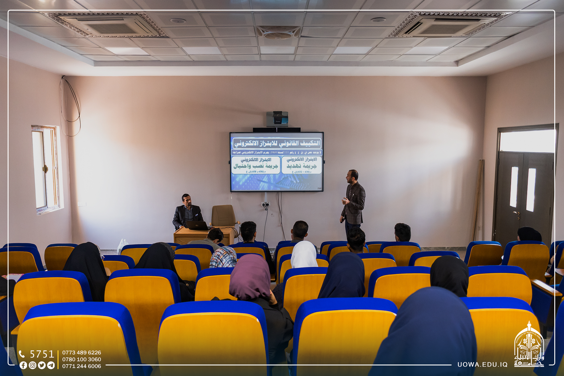 اقامت كلية القانون في جامعة وارث الانبياء (عليه السلام) ندوة علمية تثقيفية بعنوان (كيف نواجه الابتزاز الالكتروني... نفسياً وقانونياً) ألقاها: م.د احمد جابر صالح و م.د حسين محمد صادق