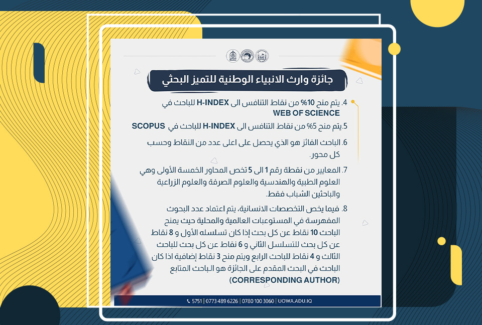 في إطار رفع مستوى البحث العلمي وتشجيع الباحثين، أعلنت جامعة وارث الأنبياء (عليه السلام) برعاية العتبة الحسينية المقدسة ووزارة التعليم العالي والبحث العلمي عن إطلاق (جائزة وارث الأنبياء الوطنية للتميز البحثي) في نسختها الثانية.