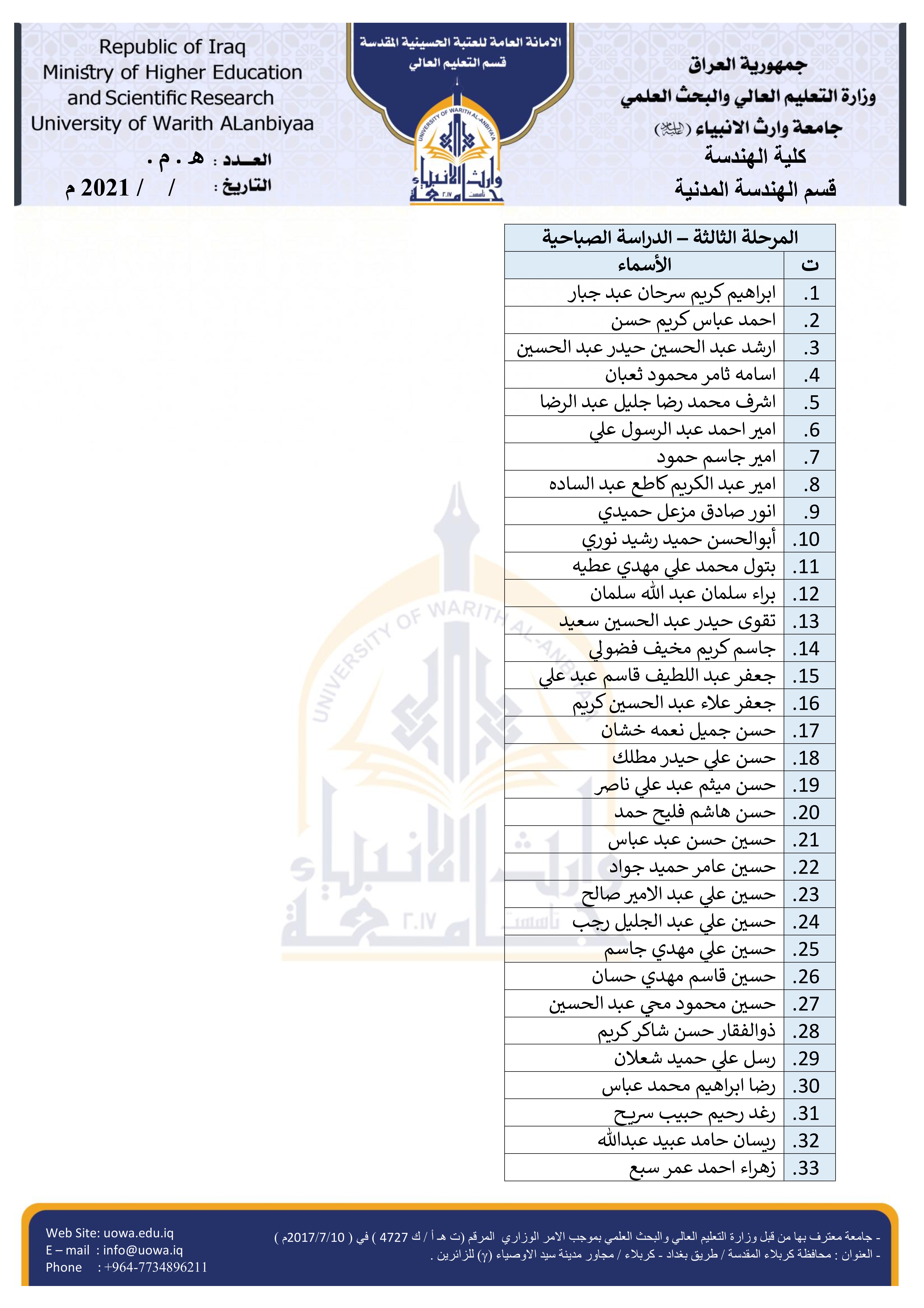أدناه قوائم الأسماء الخاصة بالطلبة المشمولين بالامتحانات الحضورية لقسم الهندسة المدنية.