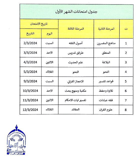 جدول امتحانات الشهر الثاني للفصل الأول المرحلة الأولى من العام الدراسي 2023-2024 قسم الفقه وأصوله