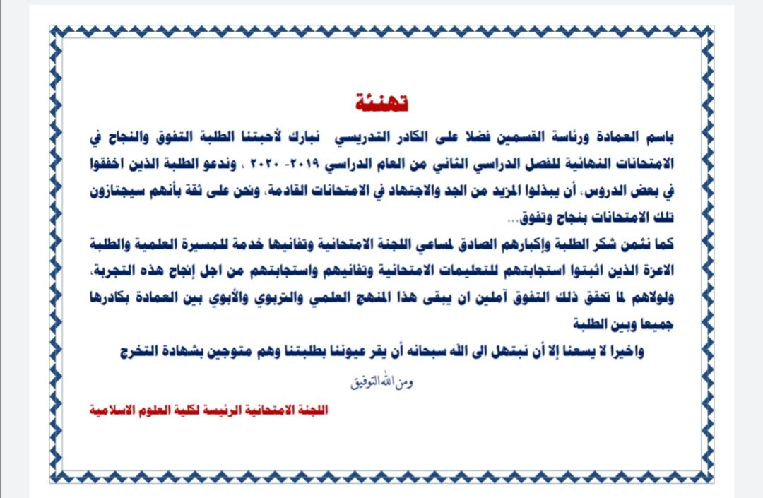 بمناسبة انتهاء الفصل الدراسي الثاني للعام2019-2020 ونجاح عملية التعليم الإلكتروني يتقدم عميد كلية العلوم الإسلامية ( الدكتور طلال فائق الكمالي) والكادر التدريسي الى الطلبة الأعزاء بأجمل التهاني والتبريكات مع فائق الشكر والتقدير على ما بذلوه من مجهود شاق واخلاص وتفان كبير في أداء واجباتهم خلال السنة الدراسية آملين أن يكون اداء امتحانات الفصل الدراسي الأول لعامنا الدراسي الحالي 2019 _ 2020 بنفس الهمة والاستعداد