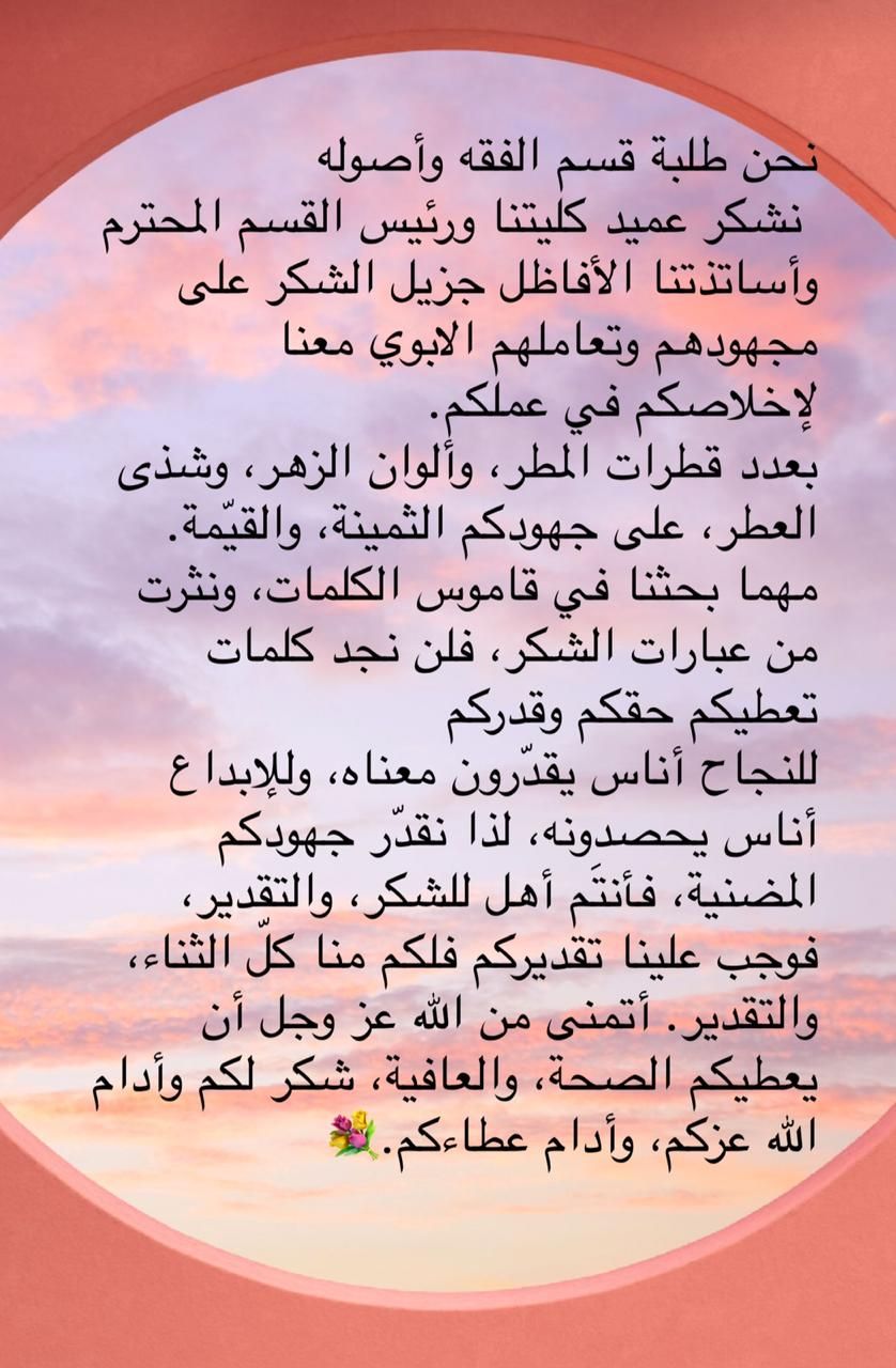 شكر وعرفان تقدم بها طلبة قس الفقه واصوله إلى عمادة وأساتذة كلية العلوم الإسلامية على ما بذلوه من جهد وتفاني طيلة السنة الدراسية