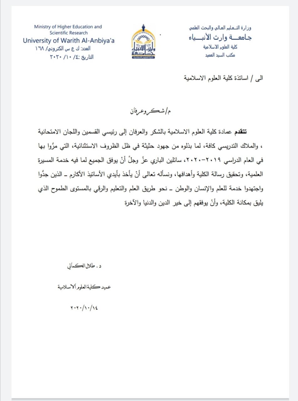قدم عميد كلية العلوم الإسلامية المحترم ( الدكتور طلال فائق الكمالي) شكر وعرفان للكادر التدريسي تقديرا لجهودهم في العام الدراسي 2019_2020