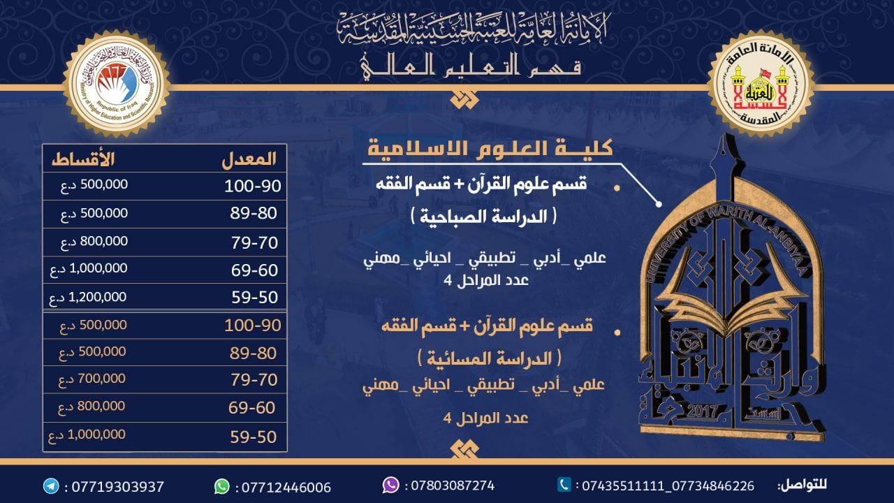 يسر جامعة وارث الأنبياء (ع) تقديم التسهيلات المالية للاقساط الدراسية للطلبة الراغبين بالتقديم على كلية العلوم الإسلامية