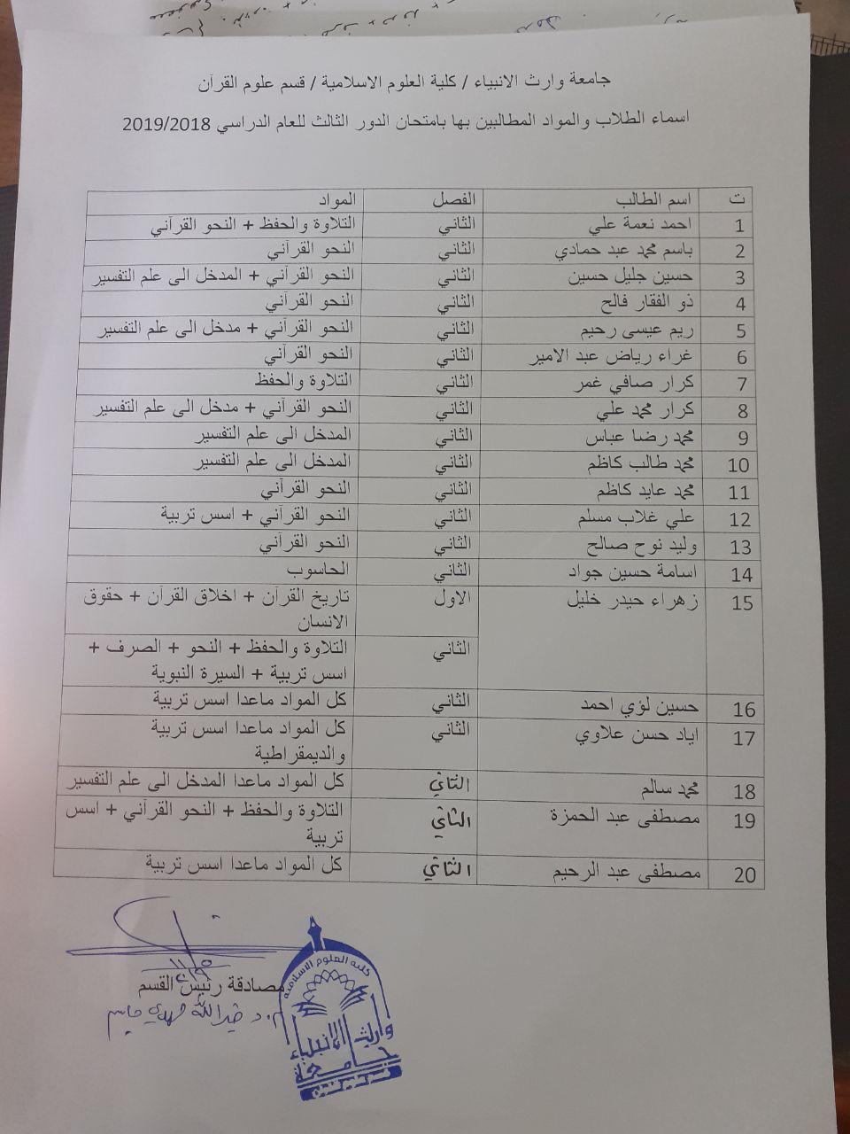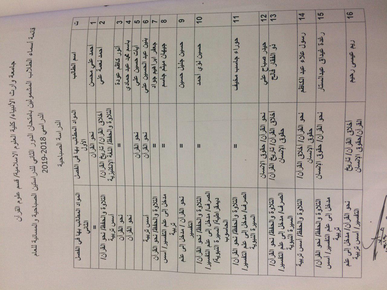 اسماء الطلبة المشمولين بالدور الثاني للدراستين الصباحية والمسائية للعام الدراسي 2018-2019