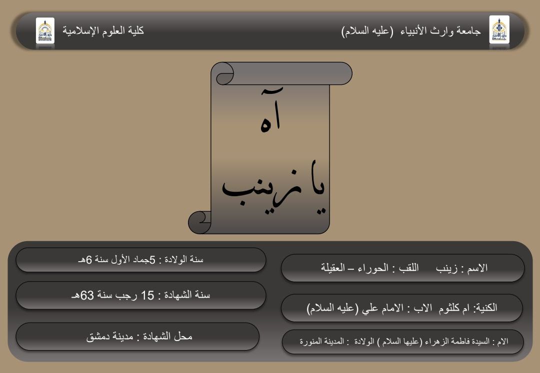 نتقدم كلية العلوم الإسلامية جامعة وارث الأنبياء (عليه السلام) بأسمى آيات الحزن والعزاء الى مقام صاحب العصر والزمان (عجل الله فرجه الشريف) ومراجعنا العظام والأمّة الإسلامية جمعاء بمناسبة وفاة السيدة الطاهرة عقيلة الطالبيين ووارثة علم النبيين السيدة زينب بنت علي بن أبي طالب (عليهما السلام) الصابرة الممتحنة ، من اجتباها الله لتصحيح مسار الرسالة وحفظ امتداد الإمامة وفضح جبابرة الظلم والإفساد.