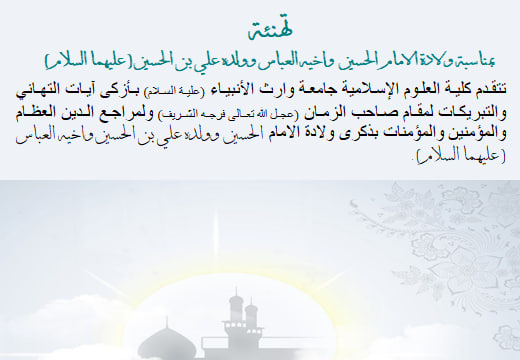 تتقدم كلية العلوم الإسلامية جامعة وارث الأنبياء (علية السلام) بأزكى آيات التهاني والتبريكات لمقام صاحب الزمان (عجل الله تعالى فرجه الشريف) ولمراجع الدين العظام والمؤمنين والمؤمنات بذكرى ولادة الامام الحسين وولده علي بن الحسين واخيه العباس ( عليهما السلام) .