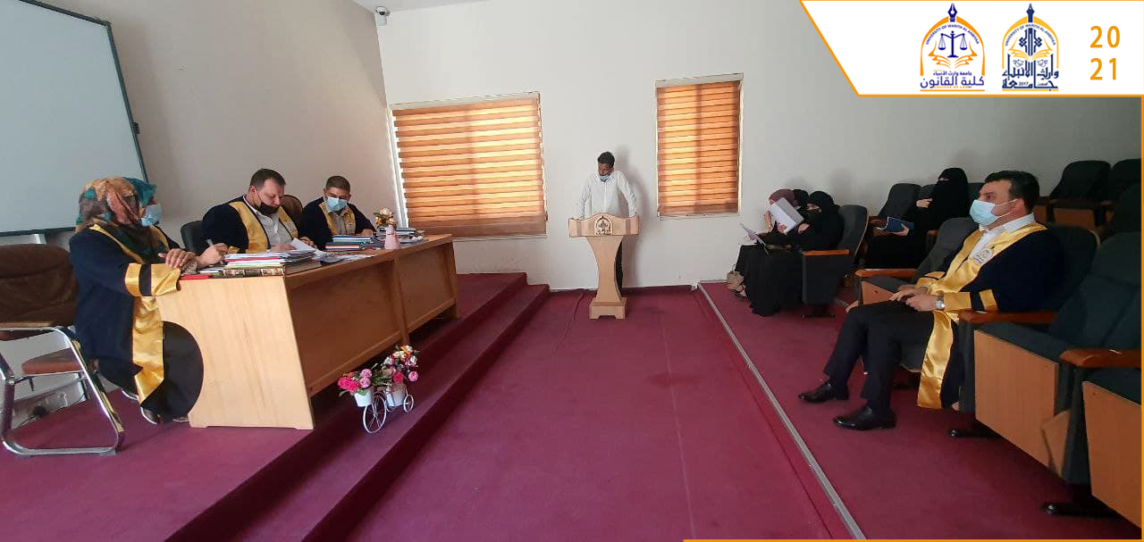 أنهت كلية القانون بتاريخ 2021/6/30 مناقشة بحوث التخرج التي جرت في قاعات الكلية من تاريخ 26/6/2021 بحضور السيد عميد الكلية أ.م.د عدنان هاشم جواد والسيد رئيس القسم أ.م.د علي صاحب جاسم .