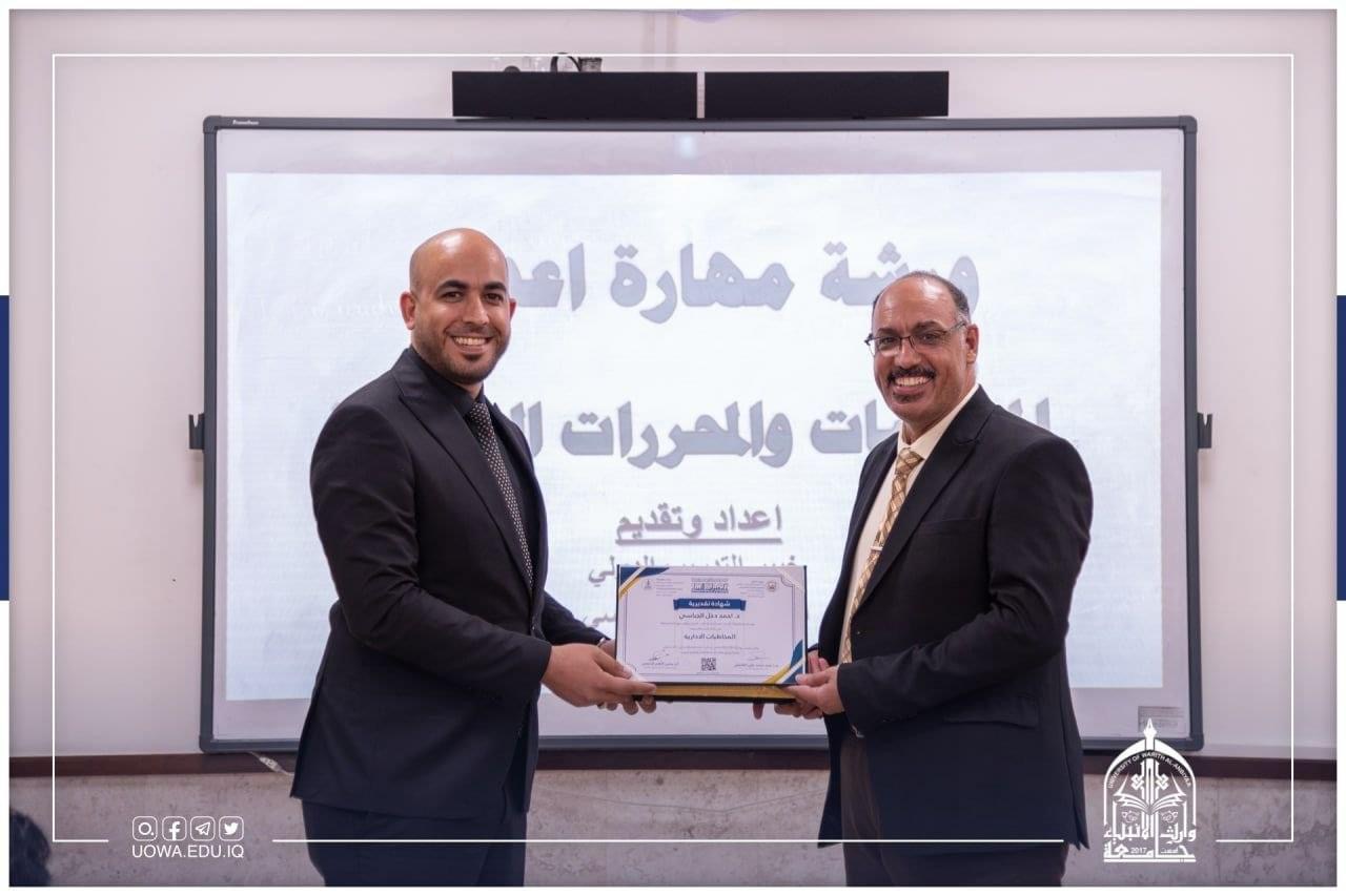 أقام مركز التعليم المستمر دورة تدريبية للسادة رؤساء الاقسام ومسؤولي الشعب والموظفين المكلفين بالمهام الادارية، دورة تدريبيةبعنوان (المخاطبات الادارية) القاها المدرب الدولي الدكتور احمد الجباسي