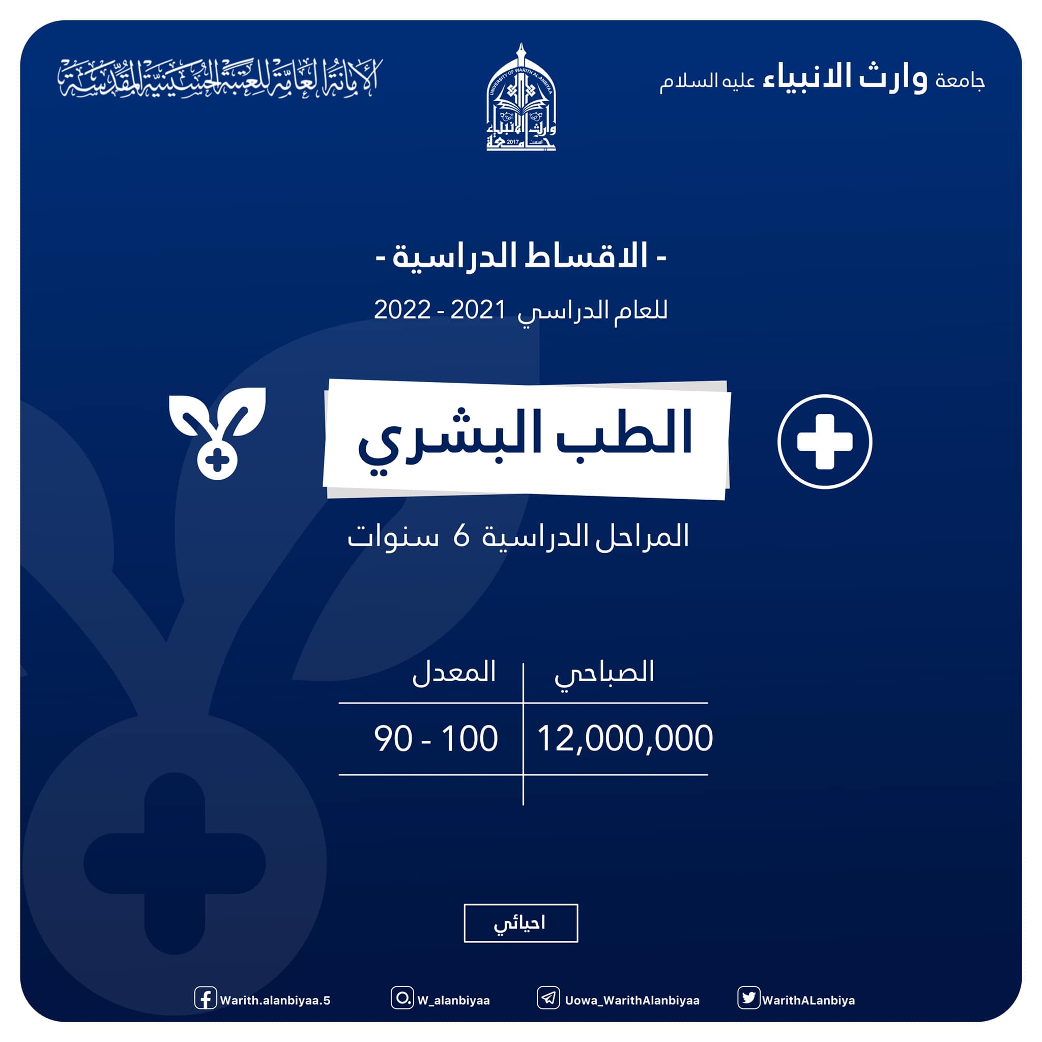 كلية الطب البشريالحد الادنى للقبول 90فرع الدراسة الإعدادية -احيائي نوع الدراسة-صباحي فقطالأقساط الدراسية -12,000,000التدريب السريري والصيفي المستشفى التعليمي -مستشفى الإمام زين العابدين (عليه السلام)
