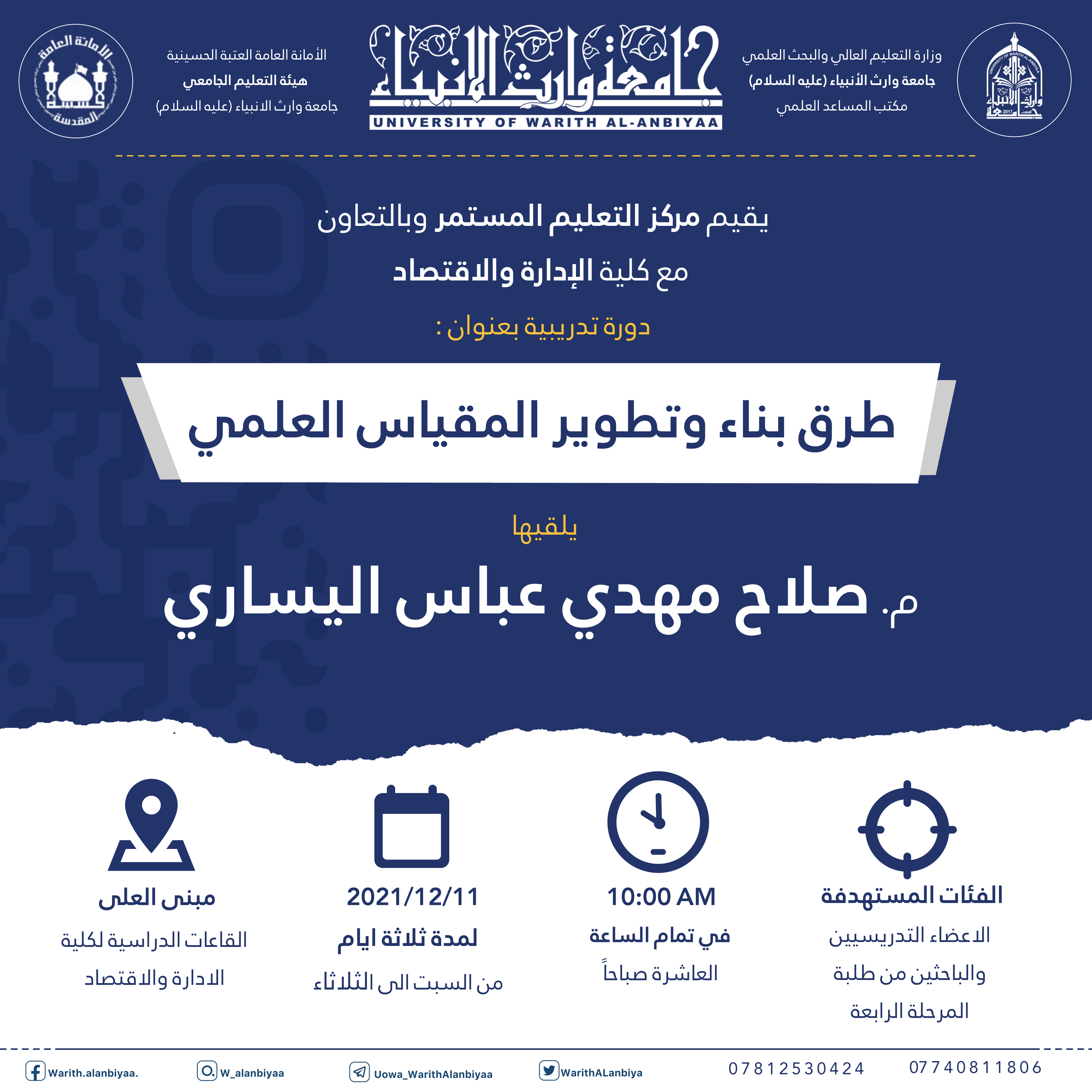 حصل التدريسي في كلية الادارة والاقتصاد صلاح اليساري على شهادة الدكتوراه بدرجة امتياز مع مرتبة الشرف عن اطروحته الموسومة (الدور التفاعلي للقيادة الروحية مابين قيم الثقافة الحسينية وسلوك العمل التطوعي دراسة استطلاعية تحليلية لاراء عينة من منتسبي لواء علي الاكبر ع - هيئة الحشد الشعبي ) من جهتها قدمت رئاسة الجامعة وعمادة كلية الادارة والاقتصاد تهنئتها ومباركتها للأستاذ المذكور راجين من الله تعالى له دوام التوفيق في مسيرته العلمية يذكر أن جامعة وارث الانبياء (عليه السلام) تطمح الى تطوير كوادرها التدريسية من خلال الحصول على الشهادات العليا والالقاب العلمية واتباع طرق تدريس حديثة ومتطورة للنهوض بالواقع التعليمي والعلمي بمستوى أرقى دعماً ومواكبةً للمسيرة العلمية في بلدنا العزيز.