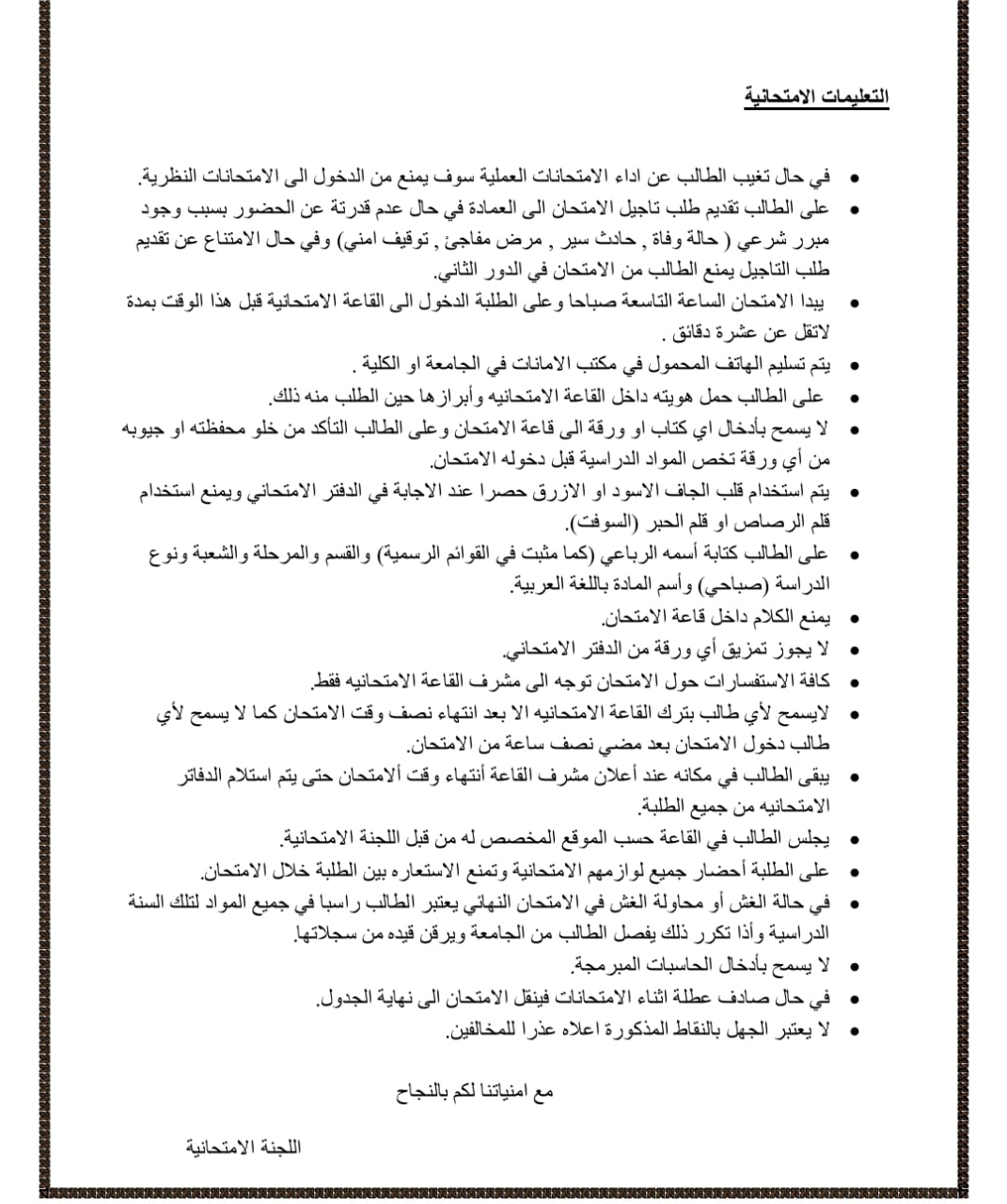 التعليمات الامتحانية لامتحان الفصل الدراسي الثاني