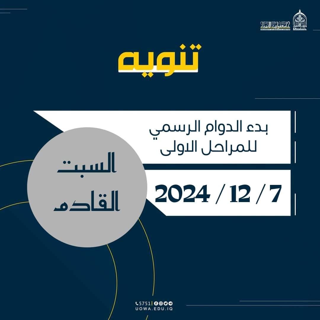#تنويه 📢تعلن جامعة وارث الأنبياء عليه السلام عن بدء الدوام الرسمي للمراحل الاولى اعتبارا من يوم السبت القادم الموافق 2024/12/7م تمنياتنا لطلبتنا الاعزاء بأن يكون عاما حافل بالابداع والتألق في المسيرة العلمية والتعليمية