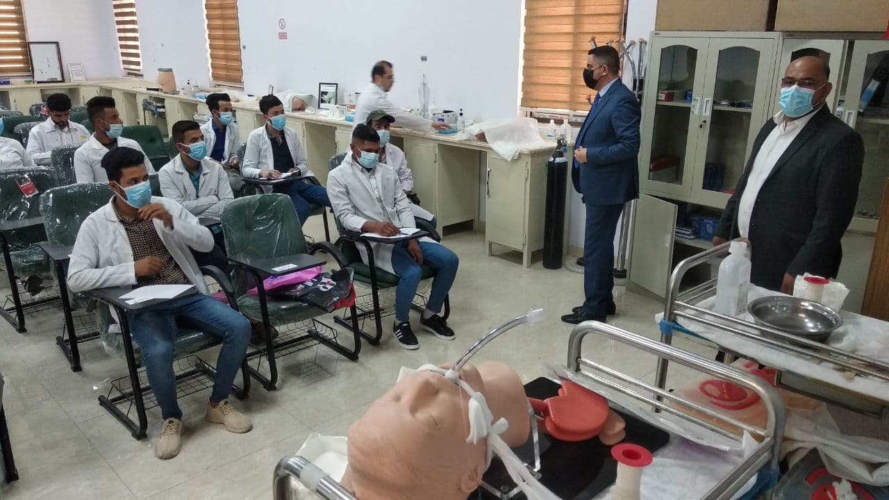 زار السيد العميد الأستاذ المساعد الدكتور مرتضى غانم عداي مختبر تمريض الحالات الحرجة واطلع على سير عملية التدريب وحث الطلبة على الالتزام بإجراءات الوقاية و السلامة