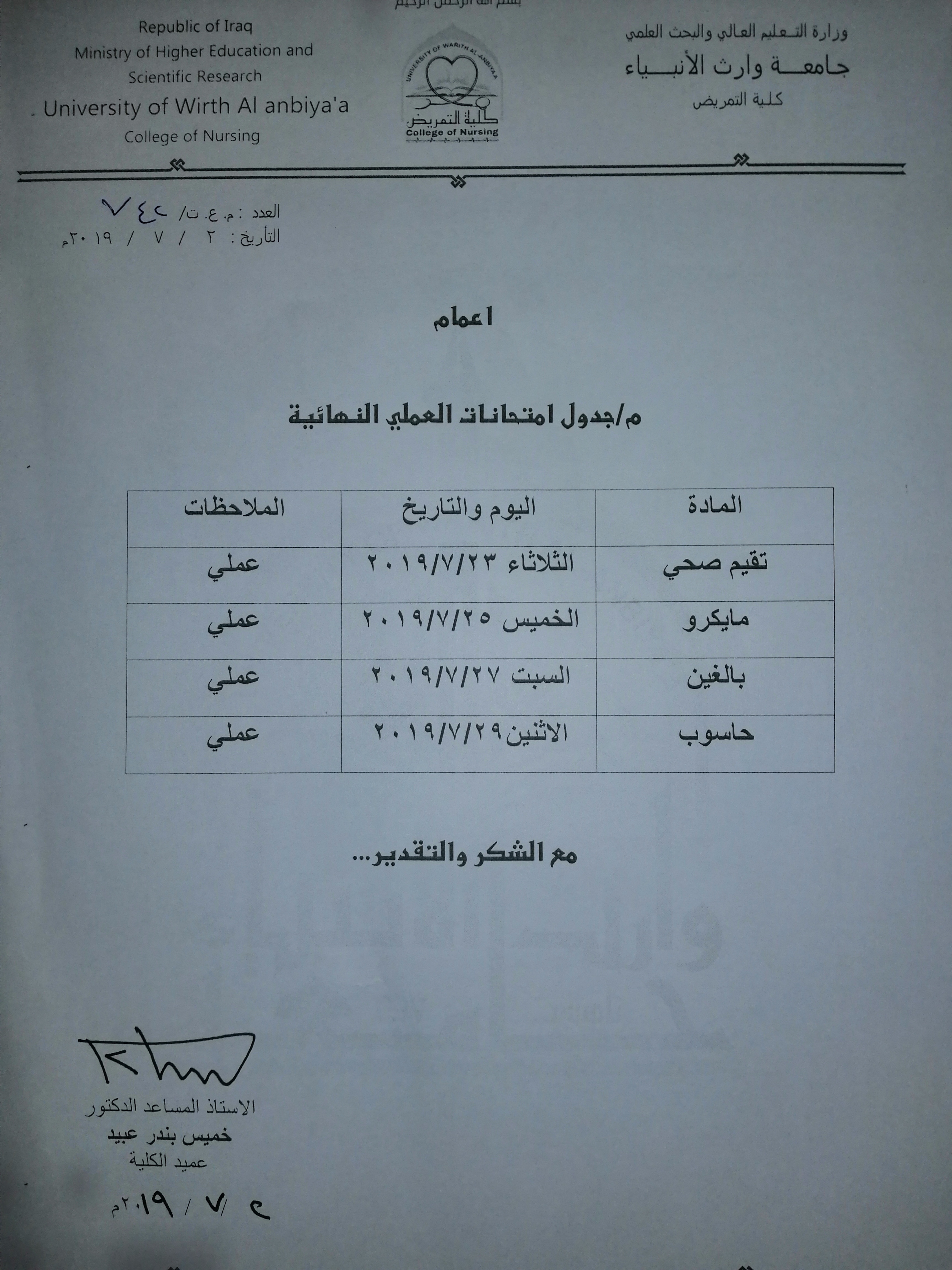 نود اعلام طلبتنا الاعزاء بأن اخر يوم لتقديم الاعتراضات هو يوم السبت الموافق ٢٩/٦/٢٠١٩.