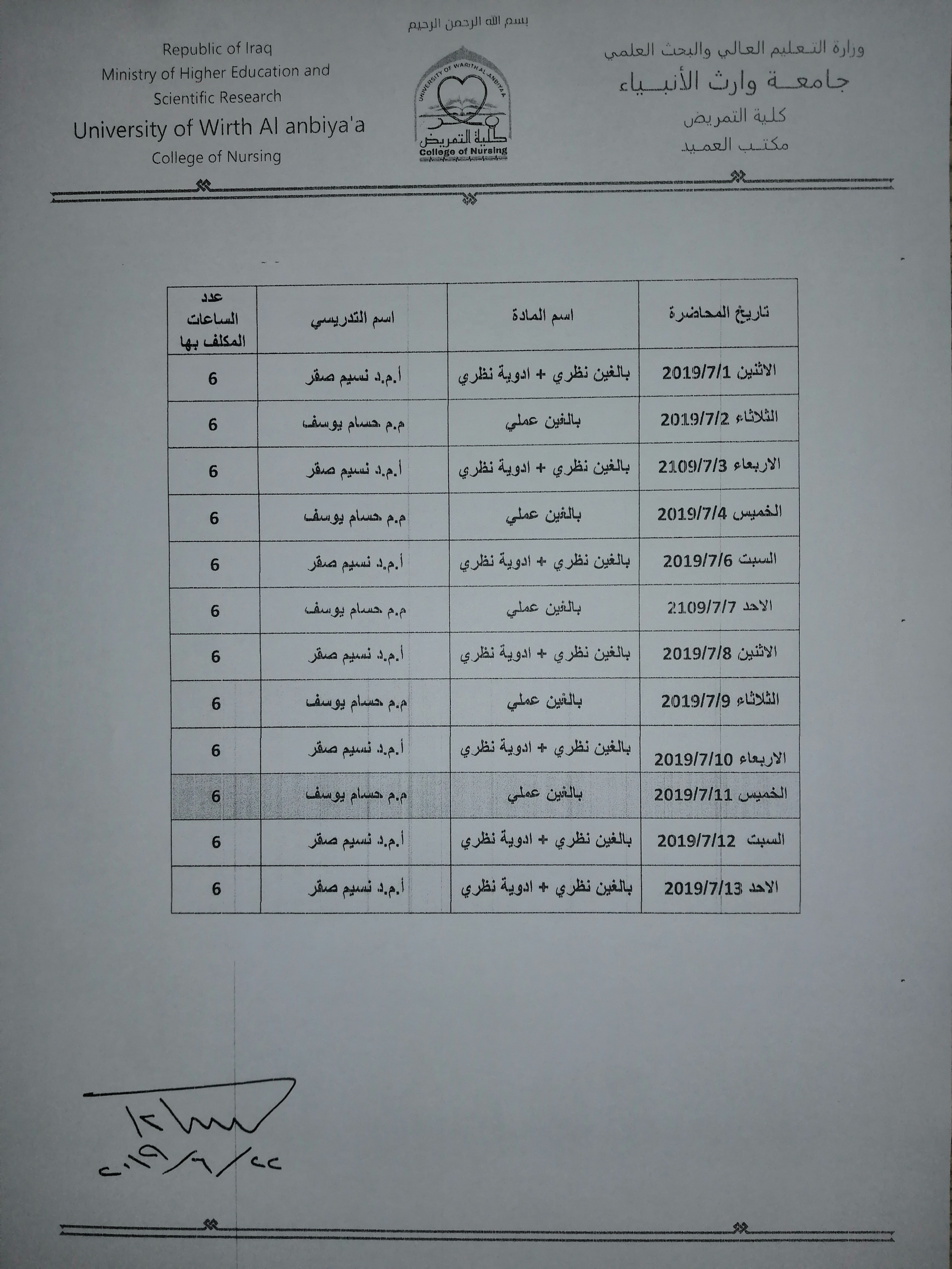 جدول محاضرات الفصل الدراسي الاول المكثف ( التعويضي)