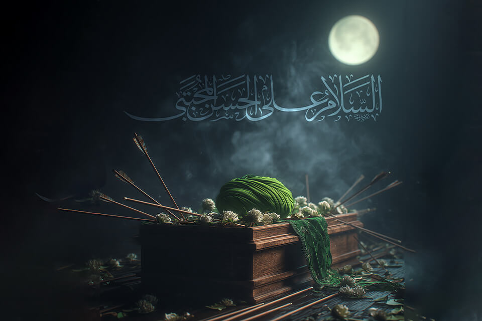 لهفي على الحسن الزاكي وما فعلت به الأعادي وما لاقى من المحن عظم الله لكم الأجر باستشهاد سبط رسول الله صلى الله عليه و آله وريحانته الإمام الحسن (عليه السلام)