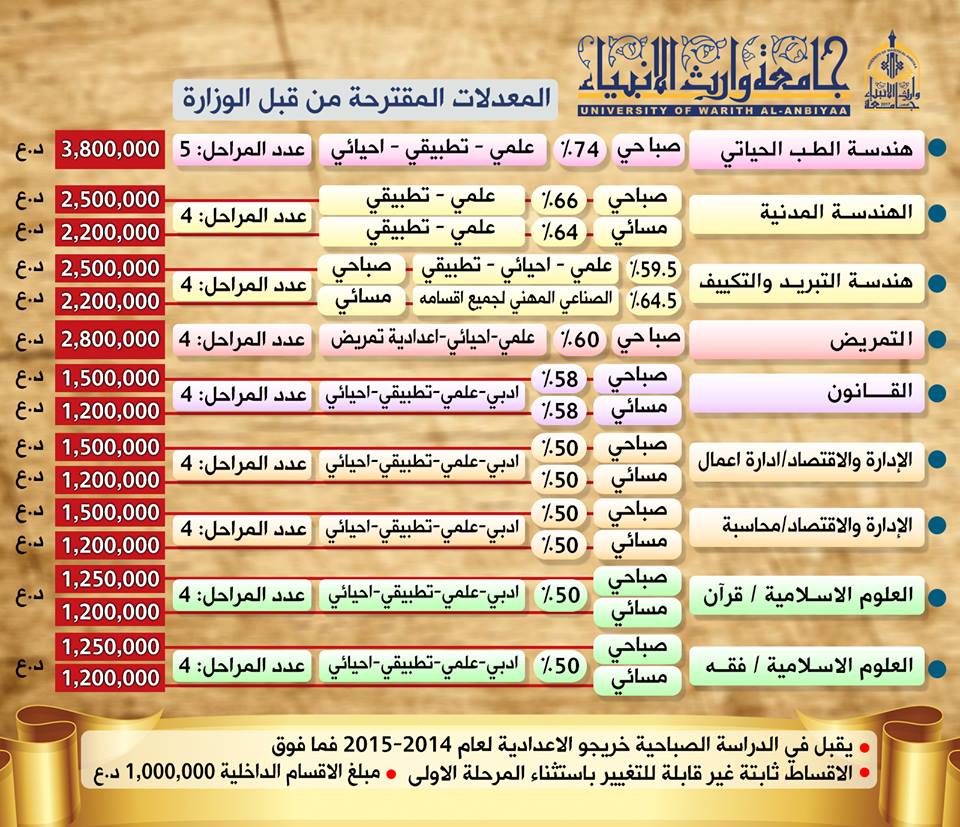 الى السادة خريجي معهد مفوضي الشرطة تعلن #جامعة_وارث_الانبياء عن توفر فرصه لقبولكم في كليتنا بالاقسام التاليه ((القانون - وادارة الاعمال - والمحاسبه - علوم قران - علوم فقه واصول الدين)) وللدراسات المسائية حصرا… المطلوب جلب عدم ممانعة من السيد وكيل وزارة الداخليه الاداري حصرا ووثيقة التخرج من المعهد وسيكون تقديمكم مع نافذه الدور الثالث .تمنياتنا لجميع طلبتنا التوفيق والنجاح.