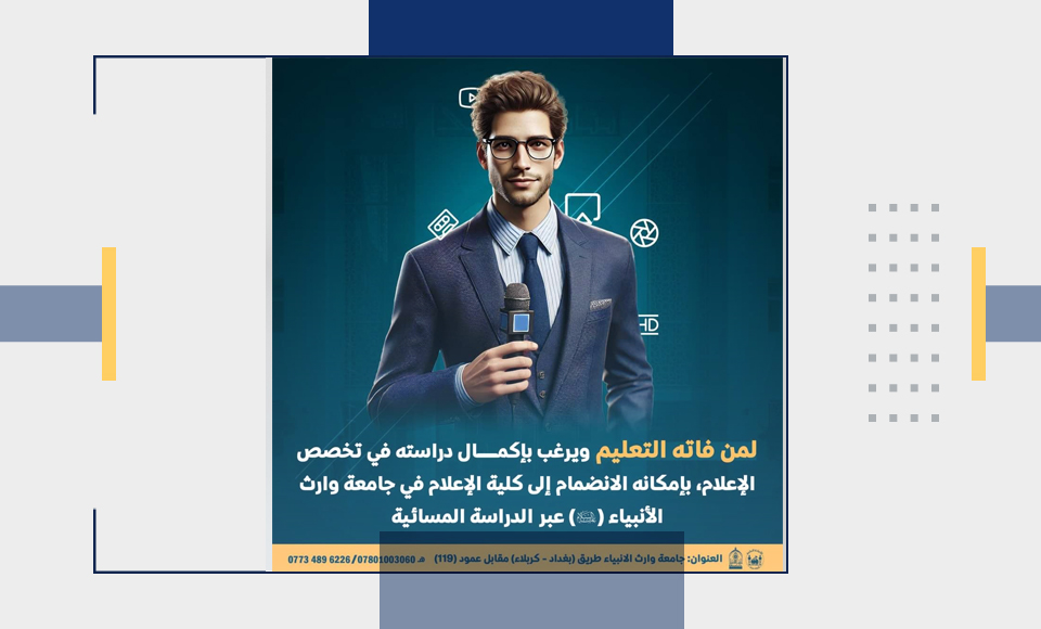 لمن فاته التعليم ويرغب في إكمال دراسته في تخصص الإعلام، يمكنه الآن الانضمام إلى كلية الإعلام في جامعة وارث الأنبياء (عليه السلام) عبر الدراسة المسائية.