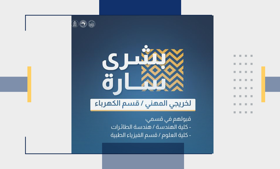 تعلن جامعة وارث الأنبياء (عليه السلام) عن شمول خريجي الدراسة الإعدادية فرع المهني/ الكهرباء بالتقديم لكلية الهندسة قسم هندسة الطائرات وكلية العلوم قسم الفيزياء الطبية.
