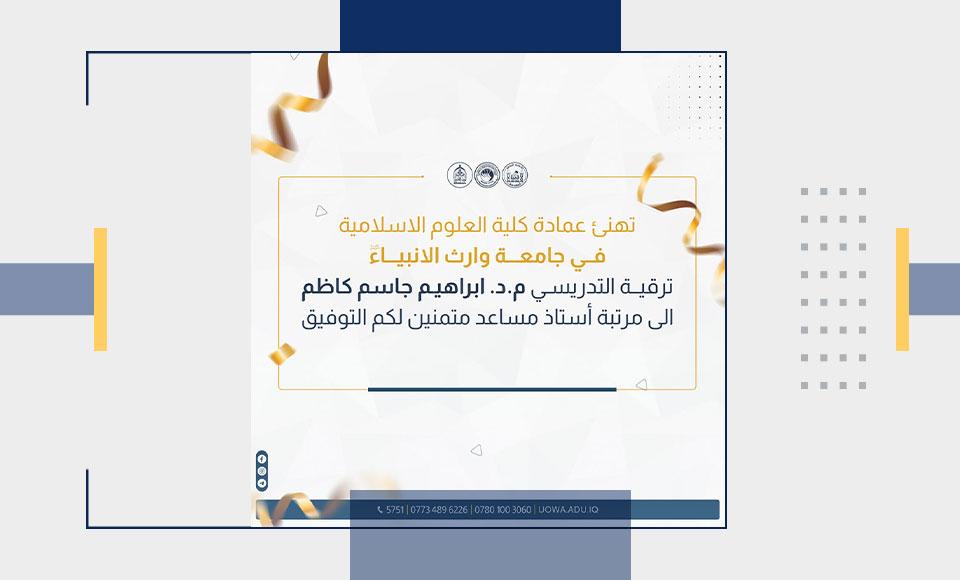 قدمت عمادة كلية العلوم الإسلامية بجامعة وارث الأنبياء (عليه السلام) التهاني والتبريكات للدكتور إبراهيم جاسم كاظم بمناسبة ترقيته العلمية إلى مرتبة أستاذ مساعد. سائلين الله عز وجل المزيد من التوفيق والنجاح له في خدمة المسيرة التعليمية في بلدنا العزيز.