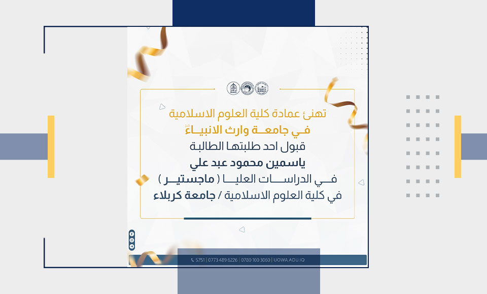 تهنئ عمادة كلية العلوم الإسلامية في جامعة وارث الأنبياء (عليه السلام) خريجيها الذين تم قبولهم في برامج الدراسات العليا (الماجستير في تخصص العلوم الإسلامية). نتمنى لهم التوفيق والنجاح في مشوارهم الأكاديمي المستقبلي.