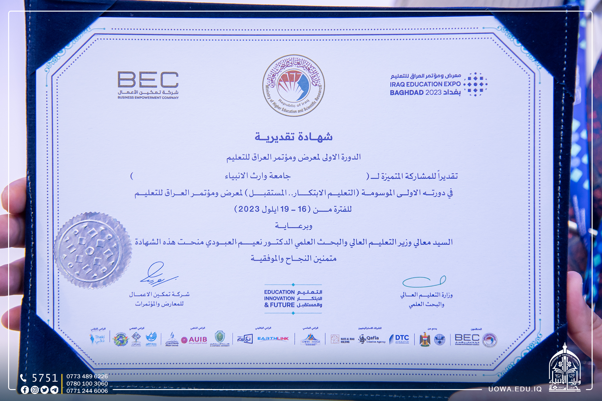 تكريم جامعة وارث الأنبياء في" معرض ومؤتمر العراق للتعليم"