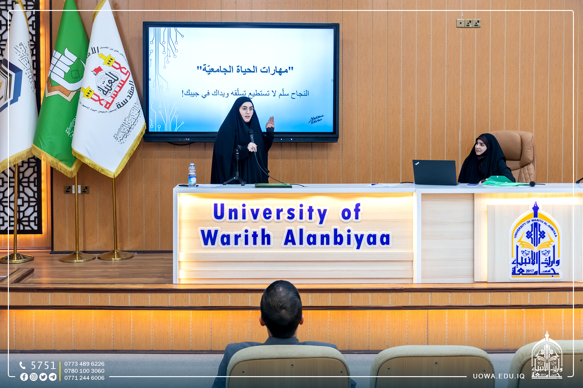 ندوة تدريبية ثقافية لطلبة جامعة وارث الانبياء (عليه السلام) بعنوان(مهارات الحياة الجامعية) اقامتها شعبة الإرشاد النفسي والتوجيه التربوي في جامعة وارث الانبياء(عليه السلام) ، قدمتها المدربة مريم جميل اخضر من دولة لبنان.