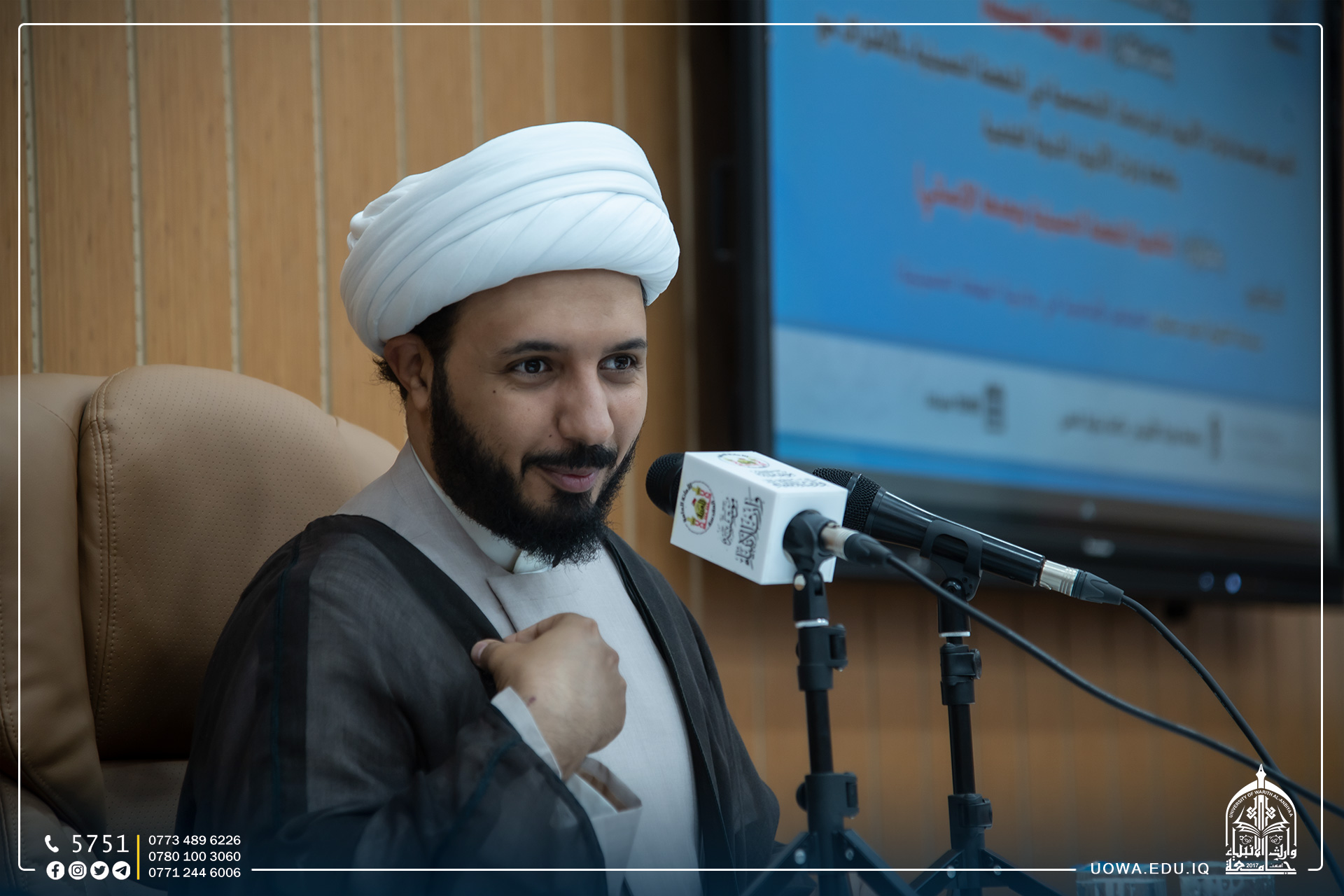 استضافت رئاسة جامعة وارث الانبياء(عليه السلام)، سماحة الشيخ احمد سلمان مدير مركز أهل البيت (عليهم السلام) للدراسات والبحوث من دولة تونس، الذي قدم ندوة علمية بعنوان ( عالمية النهضة الحسينية وبعدها الانساني)
