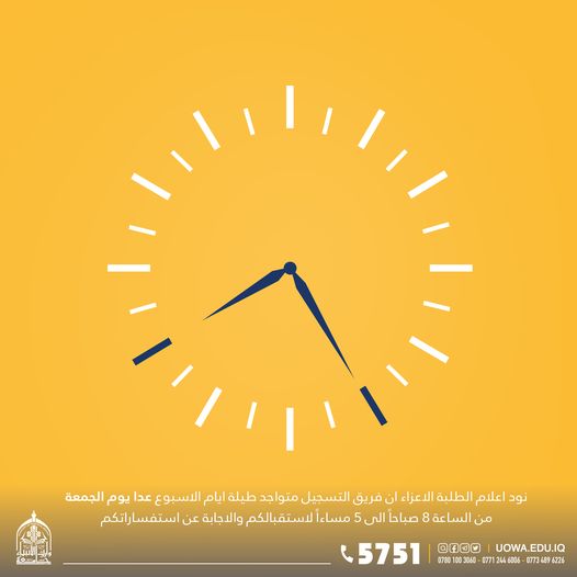 *نود اعلام الطلبة الاعزاء ان فريق التسجيل متواجد طيلة ايام الاسبوع(عدا يوم الجمعة) من الساعة 8صباحا