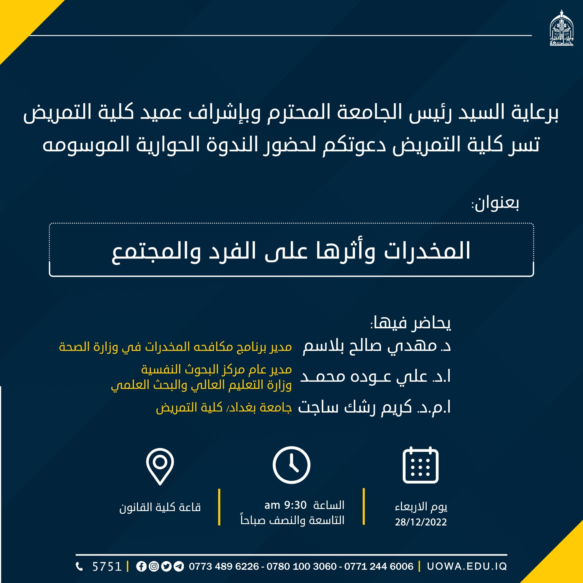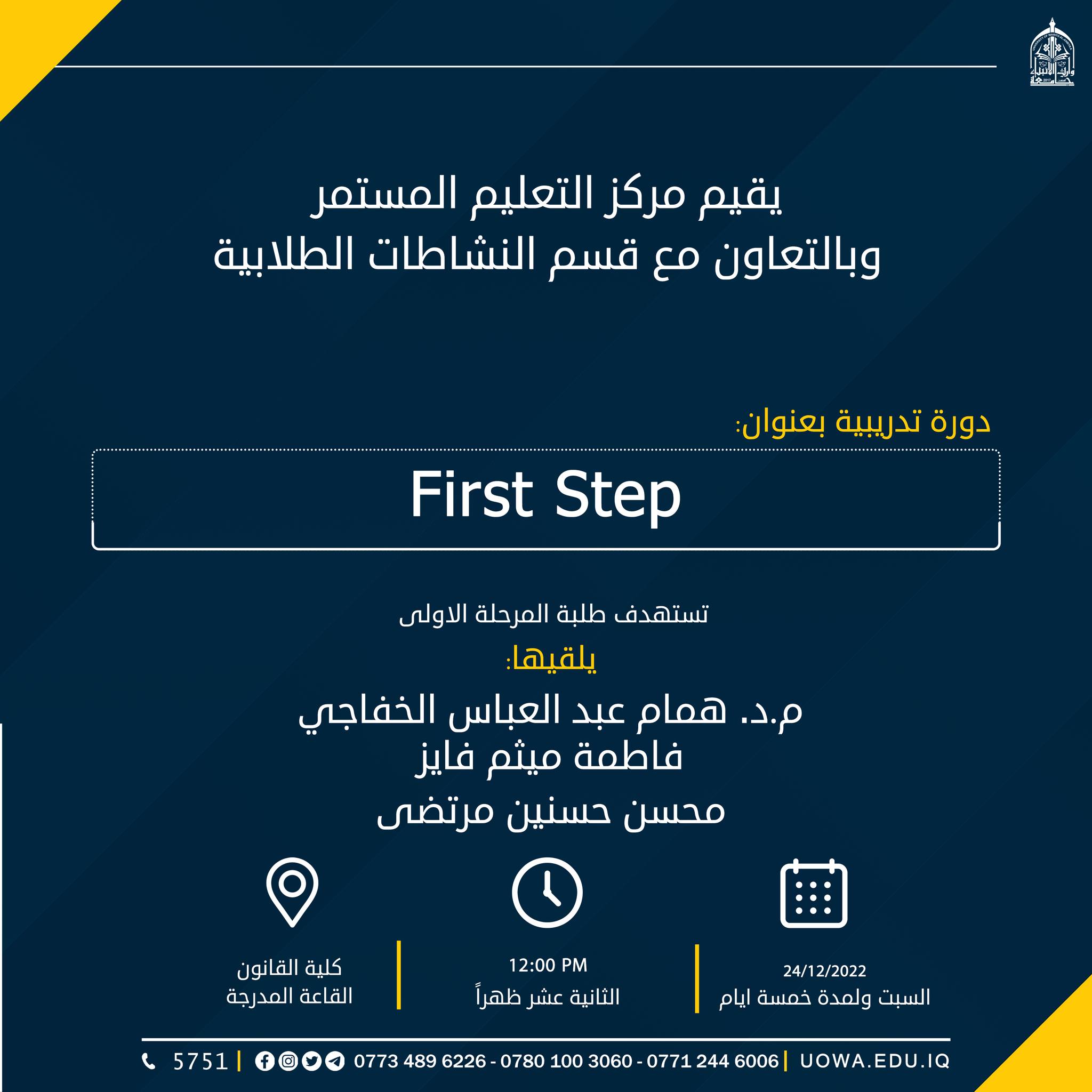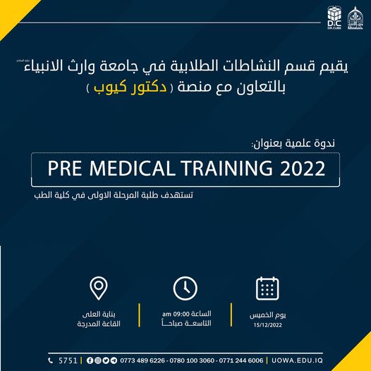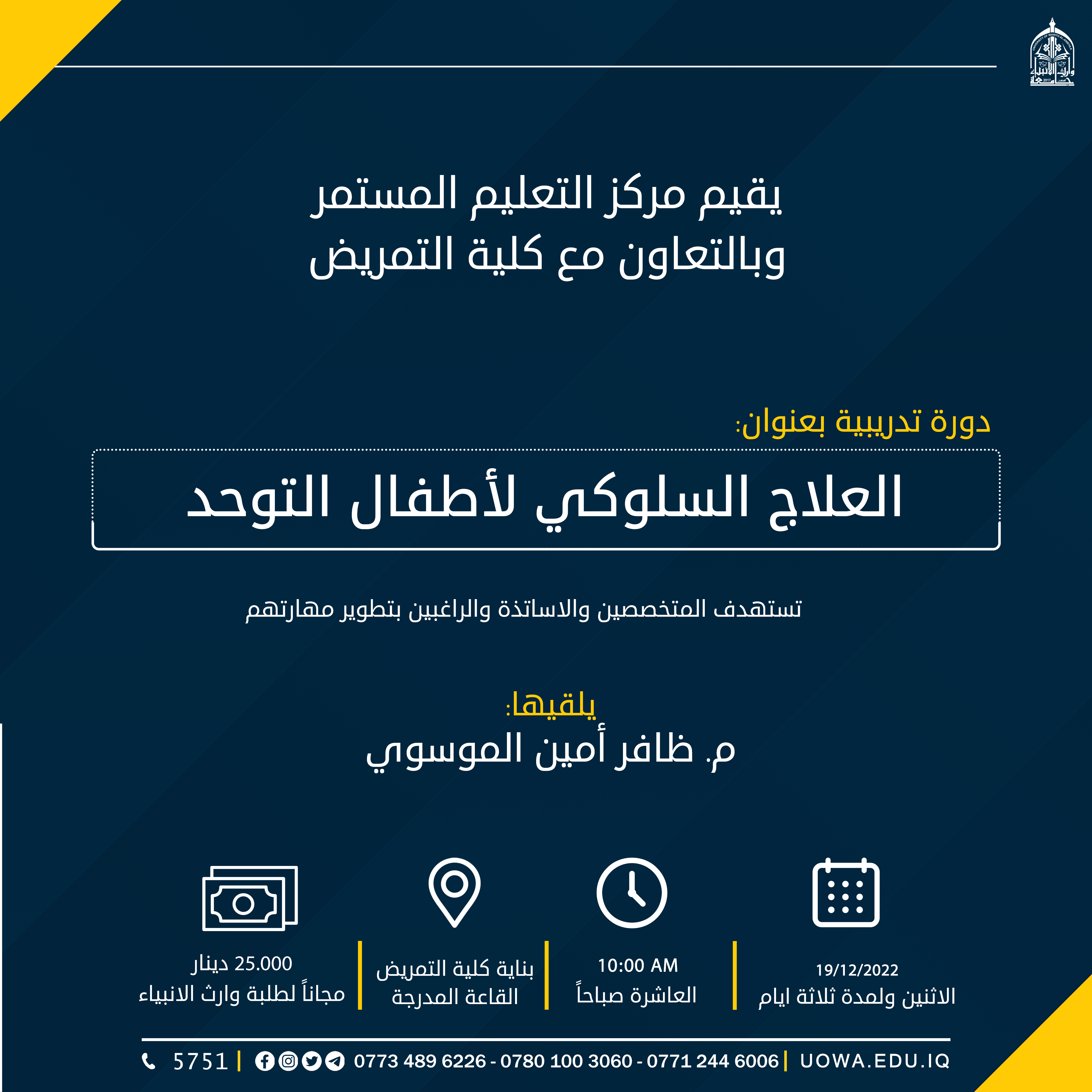 تحت رعاية السيد رئيس جامعة وارث الانبياء (عليه السلام) الاستاذ الدكتور ابراهيم الحياويوبأشراف السيد عميد كلية التمريض أ.م.د. مرتضى غانم عداي الجبورييقيم مركز التعليم المستمر في جامعة وارث الانبياء وبالتعاون مع كلية التمريض