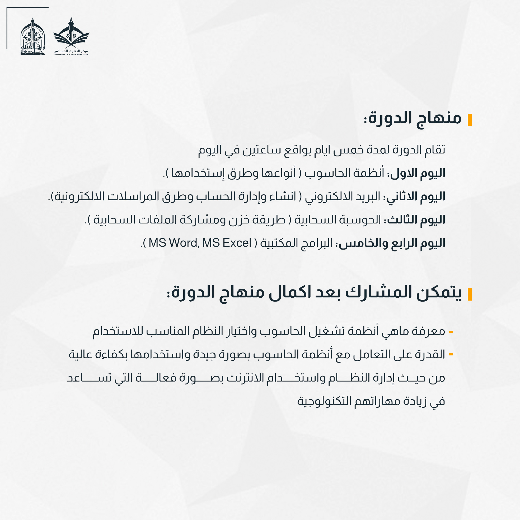 أقام مركز التعليم المستمر في جامعة وارث الانبياء(عليه السلام) دورة تدريبية لطلبة الجامعة بعنوان "مهارات الحاسوب"  تستمر لمدة خمسة أيام .