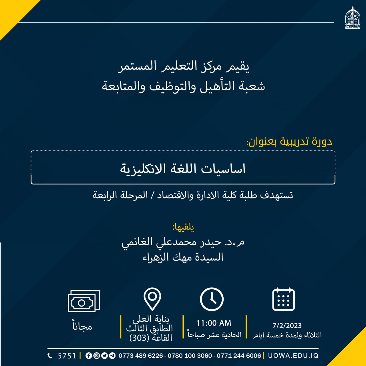 اجور الدورة25000 الف دينار عراقي للمشترك الواحد (يتم تسهديدها في قسم الشؤون المالية في جامعة وارث الانبياء).مجاناً لطلبة جامعة وارث الانبياء.