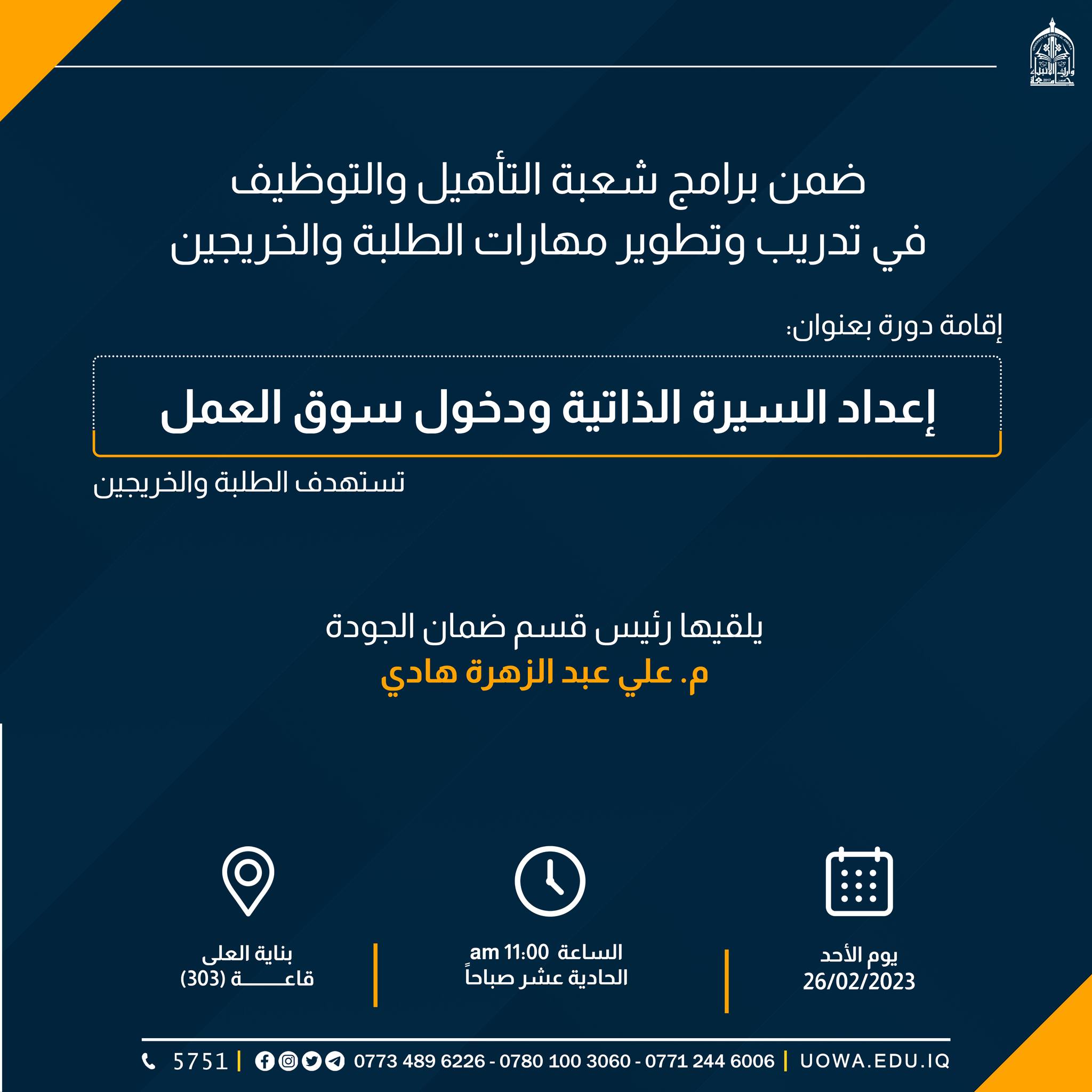 سعياً للإستفادة من العطلة الربيعية وتزويد الطلبة المقبلين على التخرج بالمهارات التي تمكنهم من الانخراط في سوق العمل، أقام مركز التعليم المستمر/ شعبة التأهيل والتوظيف والمتابعة دورة تدريبية لطلبة المرحلة الرابعة في كلية الادارة والاقتصاد بعنوان "اساسيات نظام المحاسبة الموحد " استمرت لمدة خمسة ايام، قدمها كل من م.م عبدالله سلام العادلي وم.م حيدر صالح عبد الهادي.