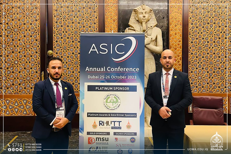 The Director of the Center for Continuing Education, Assistant Professor Dr. Haider Al-Ghanimi, and the Head of the Quality Assurance Department, Assistant Lecturer Hussein Hazim, participated in the international conference organized by the British organization ASIC (Academic and Institutional Accreditation). ASIC is an accreditation body for various international universities, institutes, and other academic institutions. The conference was held under the theme "The Impact and Results of Quality in Global Education." The university was honored with the Excellence Shield for its efforts in supporting students in various areas, including scholarships, discounts, and voluntary work in community service.