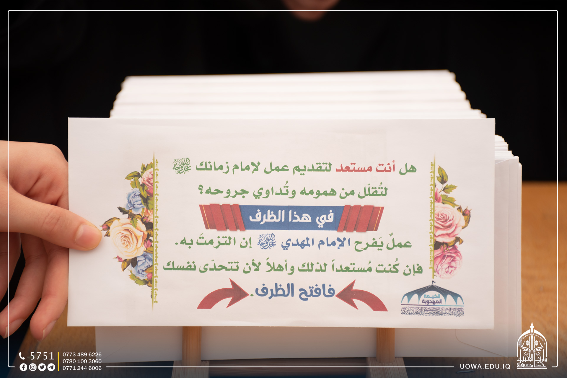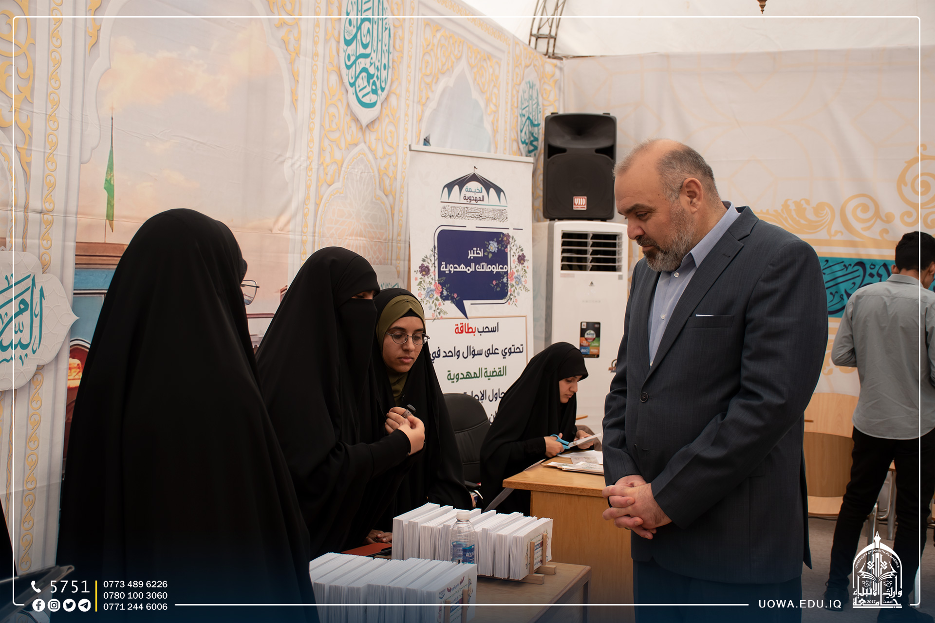 The University of Warith Al-Anbiyaa (peace be upon them), in collaboration with the Center for Specialized Studies in Imam Mahdi (peace be upon him), organized the third Mahdiyya Tent Festival. The opening ceremony of this tent was inaugurated by Mr. Ibrahim Al-Hayawi, the university president. The purpose of this tent is to disseminate the correct Mahdi thought and strengthen the spiritual connection with the Imam of the Age, may our souls be sacrificed for him, for the university students.