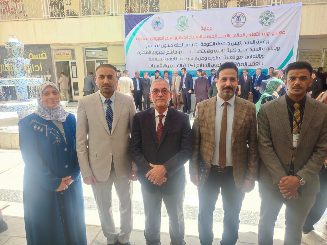 The faculty members participating in the conference are Assistant Professor Dr. Mohammed Majid Jwad, Head of the Business Administration Department at the College of Administration and Economics, University of Warith Al-Anbiya, and Assistant Professor Dr. Nidal Abdullah.
