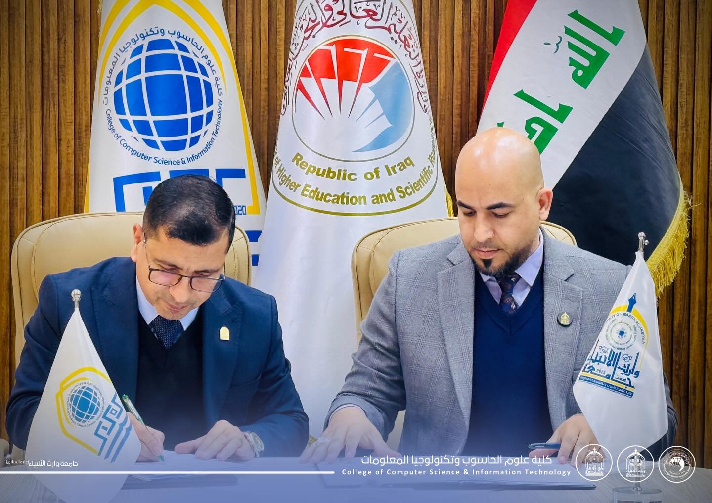 As part of strengthening academic cooperation and the exchange of scientific expertise, Assistant Professor Dr. Haider Mohammed Ali Al-Ghanmi, Dean of the College of Computer Science and Information Technology at the University of Warith Al-Anbiyaa (peace be upon him), signed a scientific twinning agreement with Assistant Professor Dr. Muwaffaq Kazem Al-Hassnawi, Dean of the College of Computer Science and Information Technology at the University of Karbala.