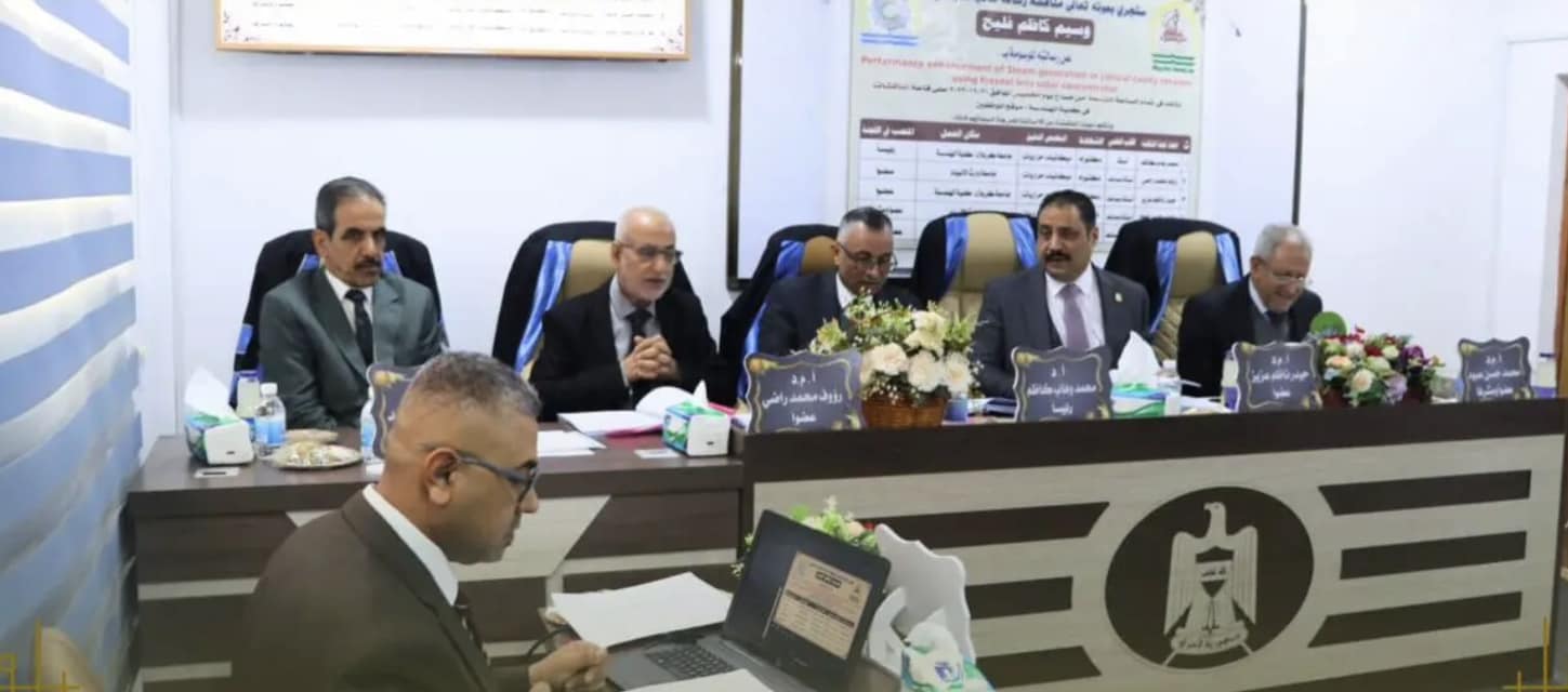 The Head of the Department of Refrigeration and Air Conditioning Engineering at the College of Engineering/University of Heir al-Anbiya (peace be upon him), Assistant Professor Dr. Muhammad Hassan Abboud (member and supervisor), and Assistant Professor Dr. Raouf Muhammad Radi (member) participated in the discussion of the master’s thesis that was conducted within the Mechanical Engineering Department at the University of Karbala. He discussed the thesis of researcher Waseem Kazem Falih entitled (Improving the performance of steam generation in conical cavity receivers using a Fresnel lens)The study aims to increase the efficiency and productivity of the solar steam generation system by using conical cavity receivers, a glass cover, and a Fresnel lens of both linear and dot types..