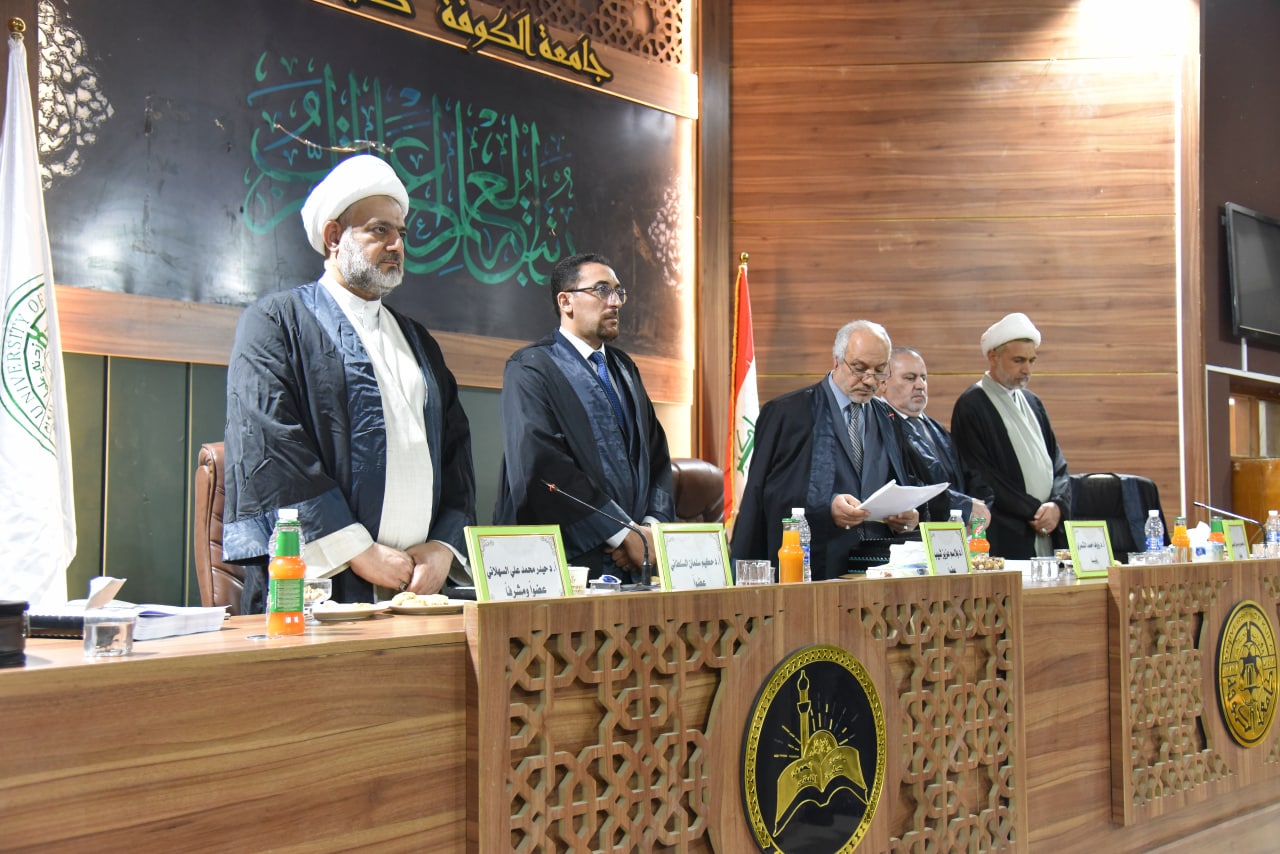 Assistant Prof. Dr. Hakim Salman Al-Sultani participated as a member of the thesis defense committee for the PhD dissertation presented by student Hussein Fadhel Mohsen Al-Hakim. The dissertation, titled "The Authority of Religious Texts: A Study in Quranic Foundations and Jurisprudential Principles," was defended on Tuesday, November 1, 2022, in the discussion hall of the Faculty of Jurisprudence at the University of Kufa.