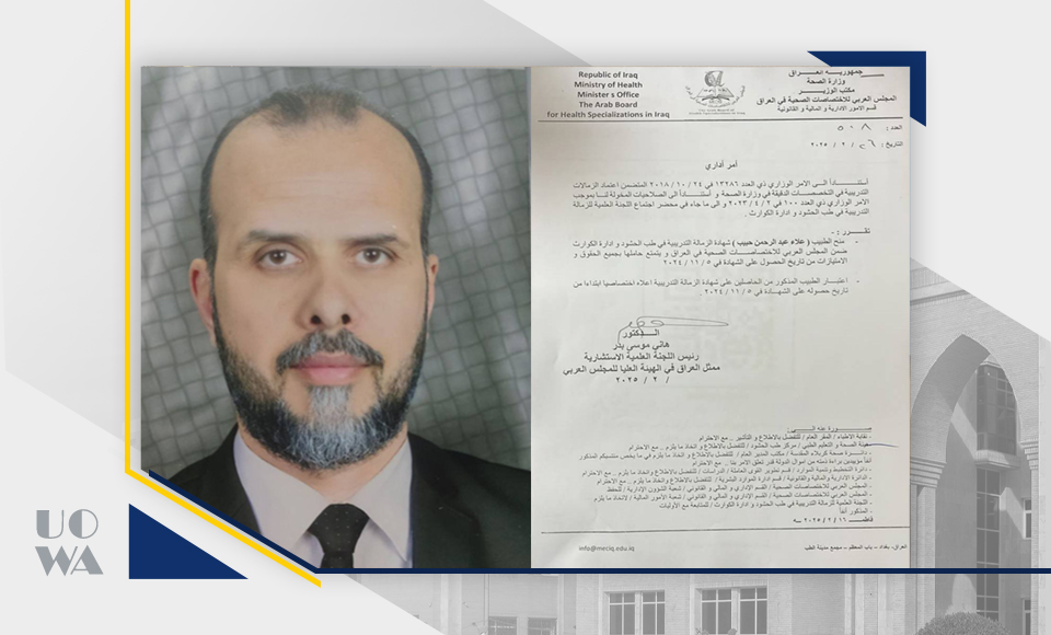 The College of Medicine at Warith Al-Anbiya University, represented by the Dean of the College of Medicine, Professor Ali Abdul-Saadoun Al-Ghazi, extends its warmest congratulations to Dr. Alaa Abdul-Rahman Habib on receiving his fellowship in emergency medicine from the Arab Board for Health Specialties in Iraq.