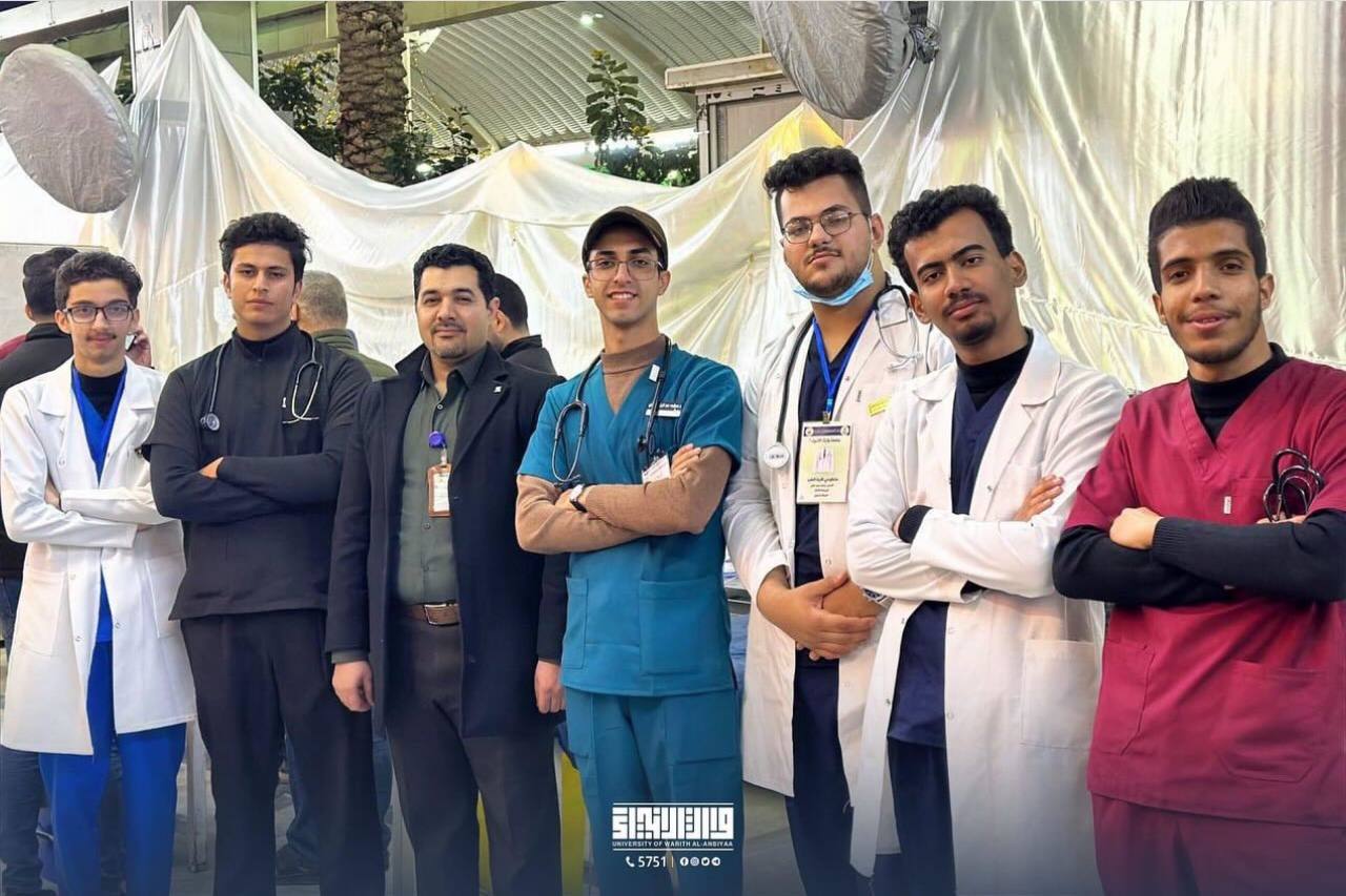 A number of medical students from the University of Warith al-Anbiya (peace be upon him) participated as part of the medical cadres in the specialized detachments of the Ambassador of Imam Hussein (peace be upon him) Hospital, to provide health services and first aid to the visitors of Imam Hussein and Abu al-Fadl al-Abbas (peace be upon them), during the flag-changing ceremony on the first of Muharram.