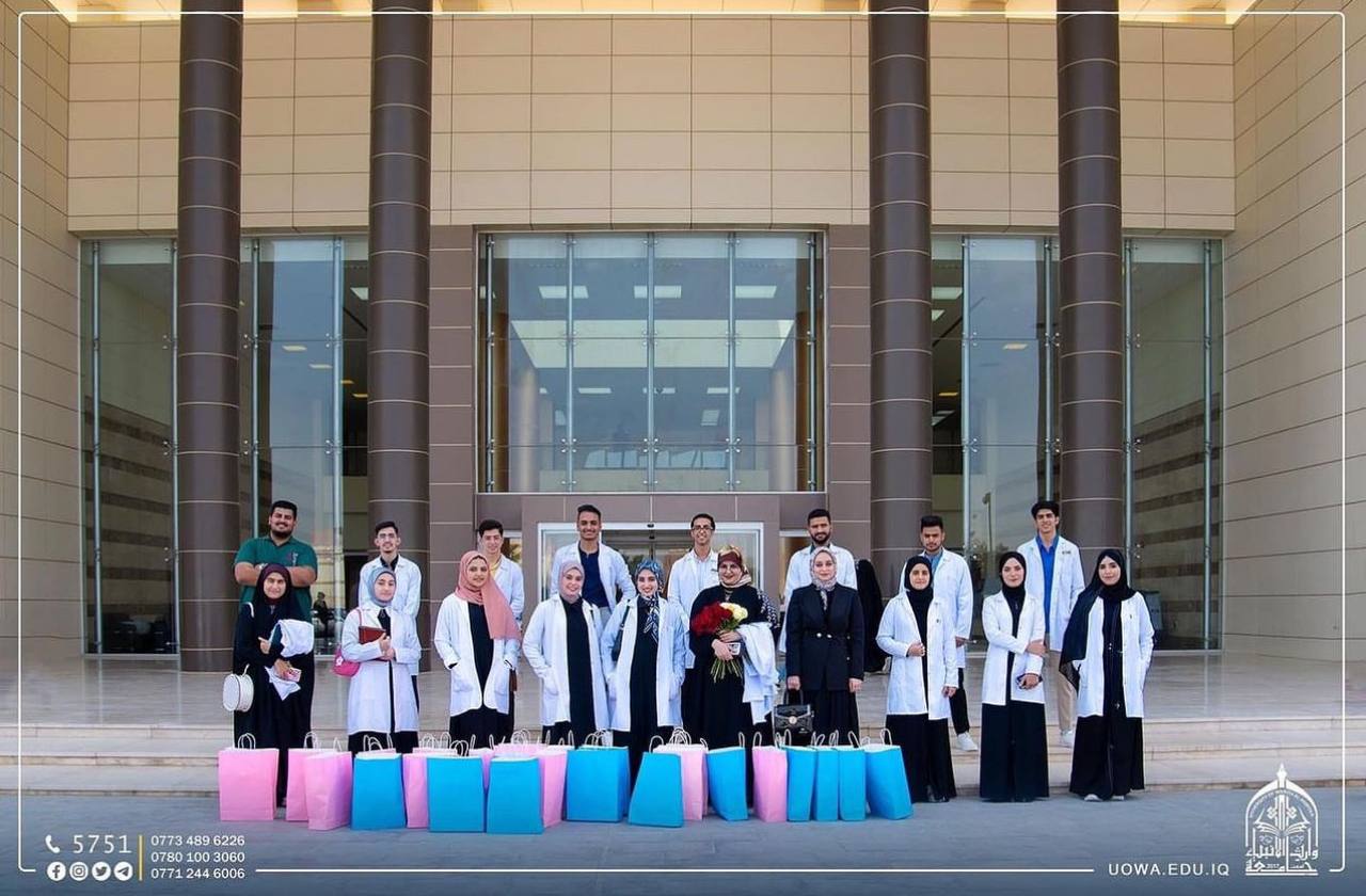 Under the patronage of the esteemed University President and the supervision of the Dean of the College of Medicine at Warith Al-Anbiya University, second-year students organized a field visit to the Children's Hospital in the Holy City of Karbala. During the visit, a number of students visited the hospitalized children, presenting them with gifts and offering them moral support, bringing joy and happiness to their hearts. This visit is part of the humanitarian activities organized by the college to enhance the spirit of cooperation and responsibility among students and to develop their social and humanitarian awareness.