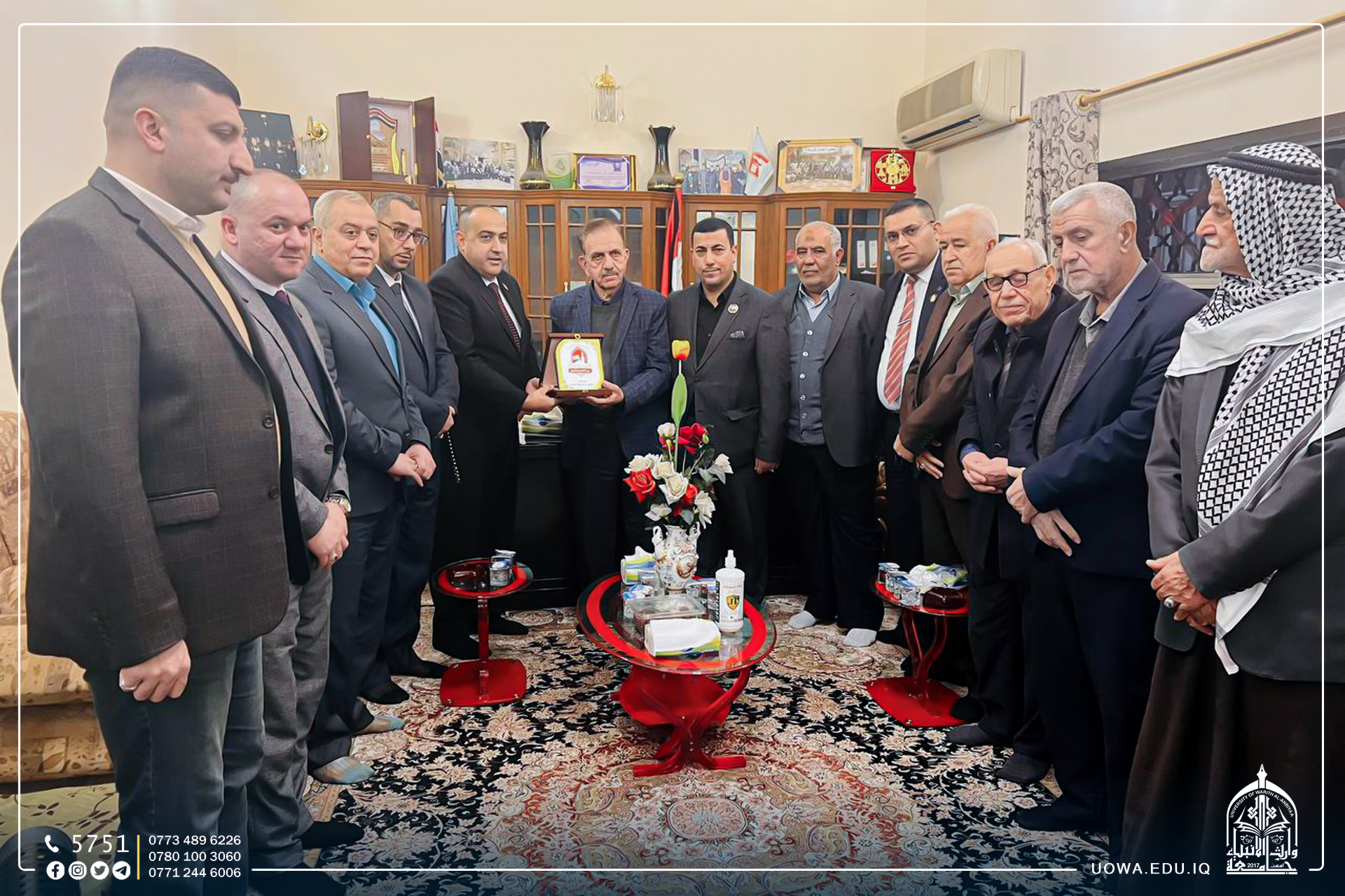 The Council of the Holy Province of Karbala Senate, in the presence of Karbala Surrogate, Mr. Hussein Al-Mangoshi, honored the President of the University, Prof. Dr. Ibrahim Saeed Al-Hayawi, with the Shield of Excellence and a certificate of appreciation in appraisal of his valuable efforts and high keenness in serving the educational process in our beloved country.